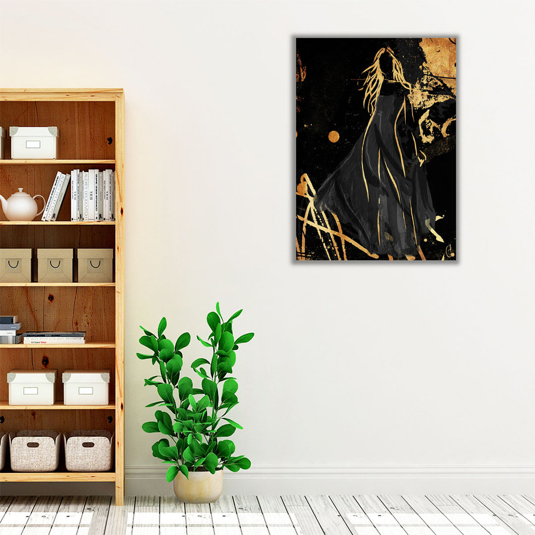 An abstract composition comes to life with a golden-hued girl set against deep black tones, exuding depth and mystery.