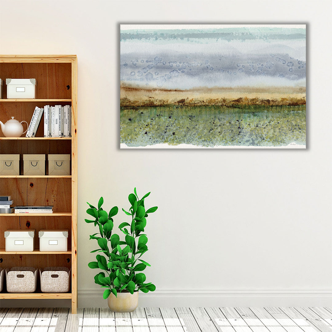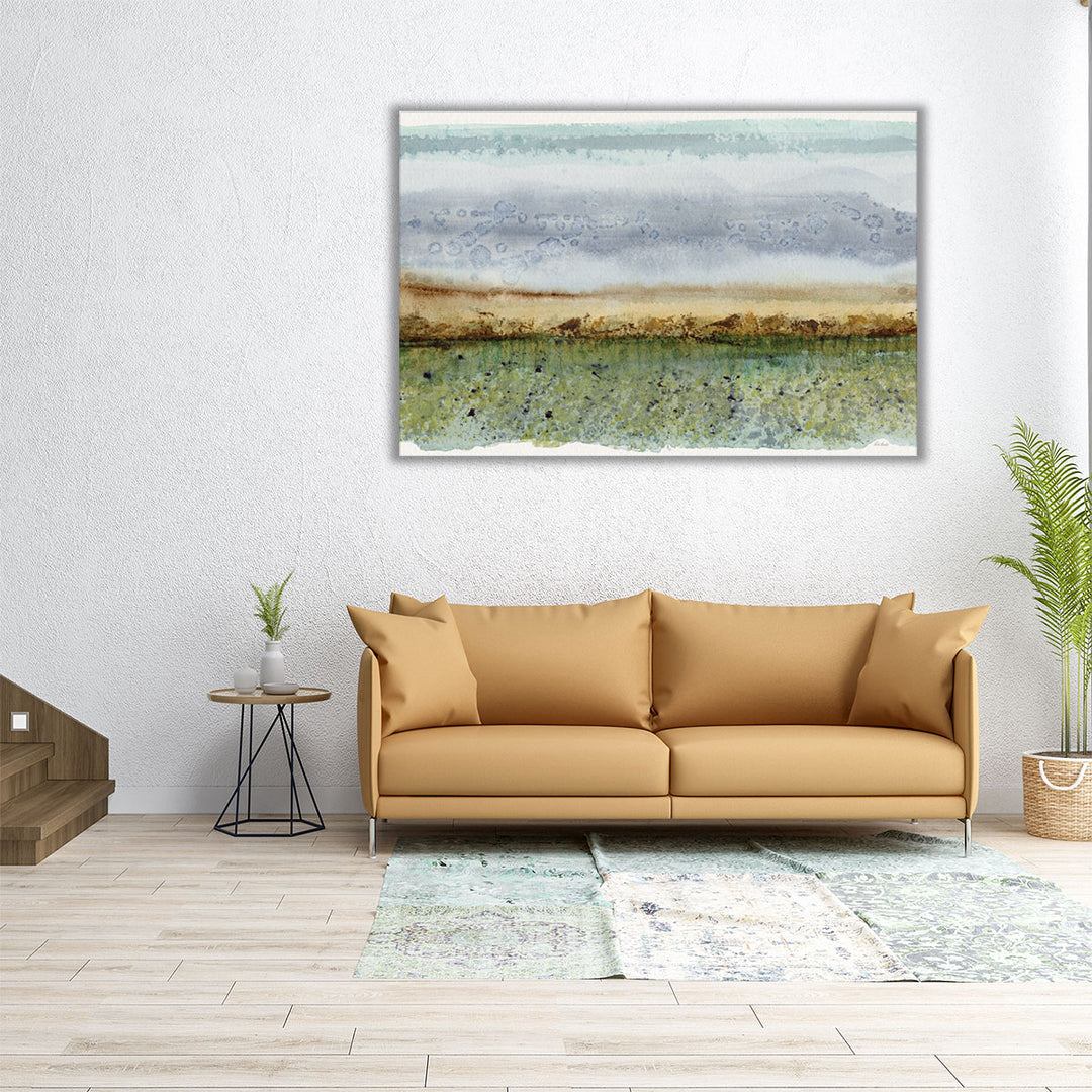 This abstract piece blends neutral tones with calming shades of blue and green, creating a dynamic and peaceful atmosphere in any space.