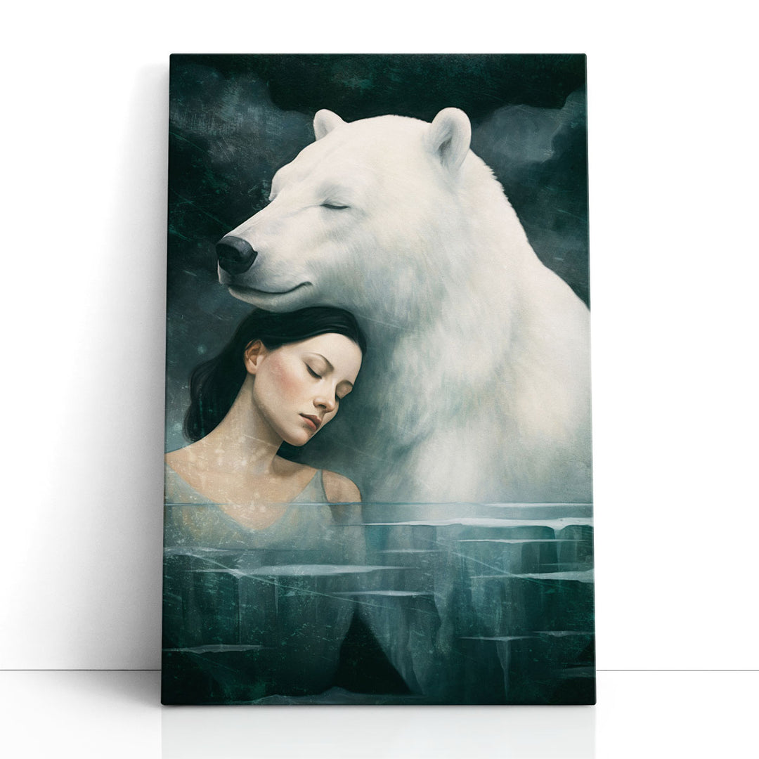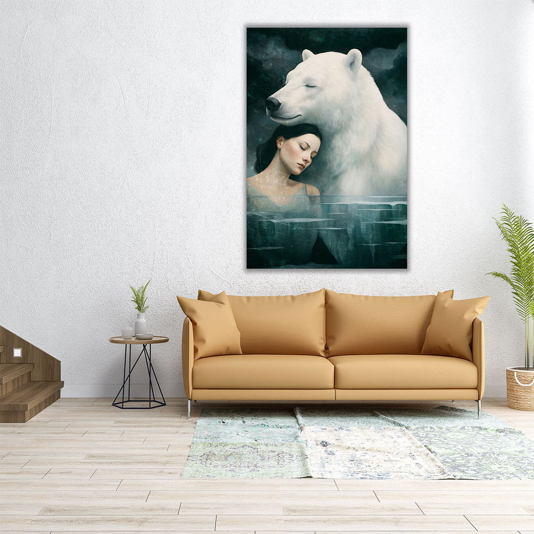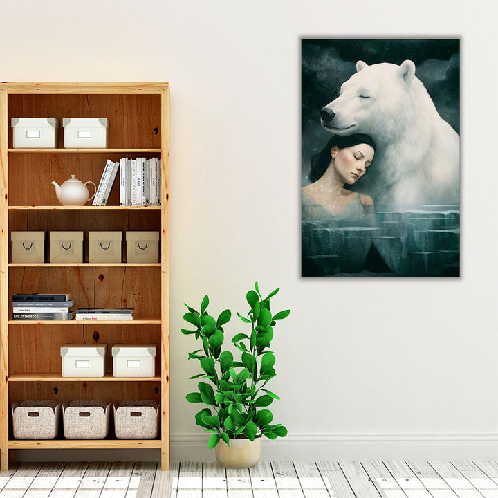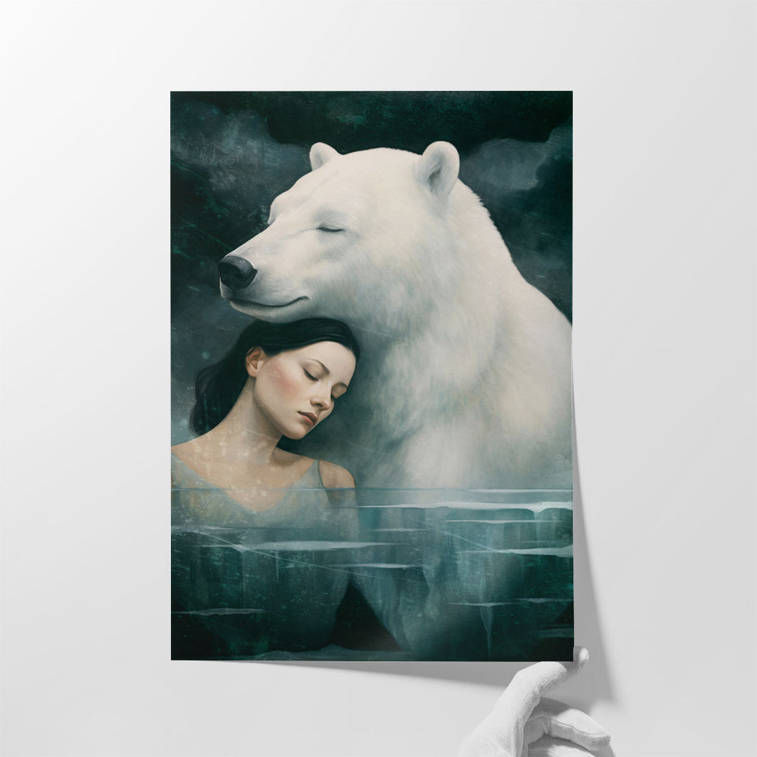 This surreal artwork shows a serene woman gently resting her head on a polar bear, capturing a tender moment of peace and connection.