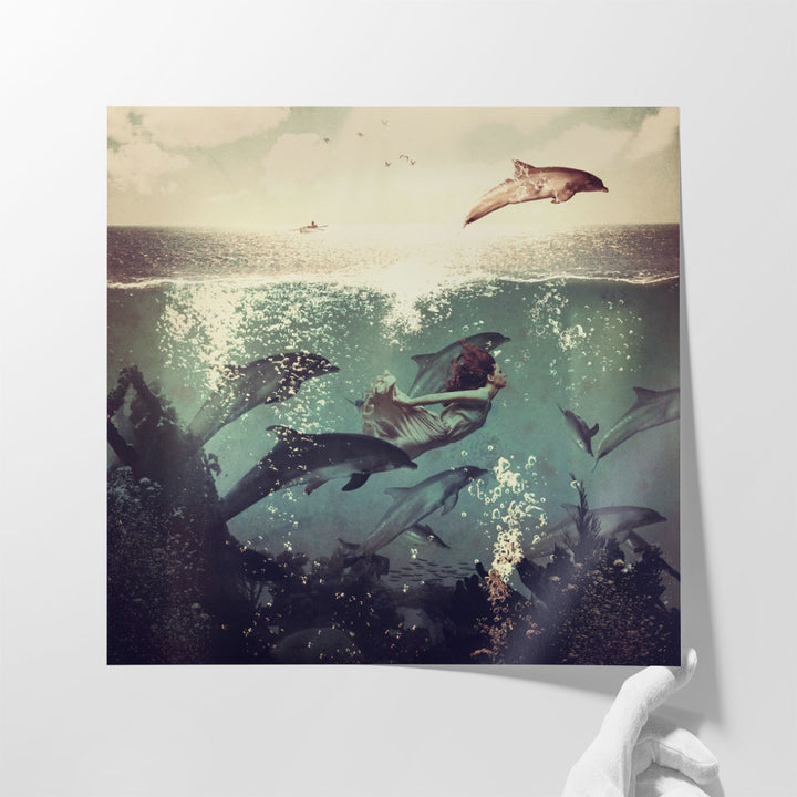 An enchanting underwater scene featuring a woman swimming with fish in calming blue tones, evoking a sense of motion and serenity.