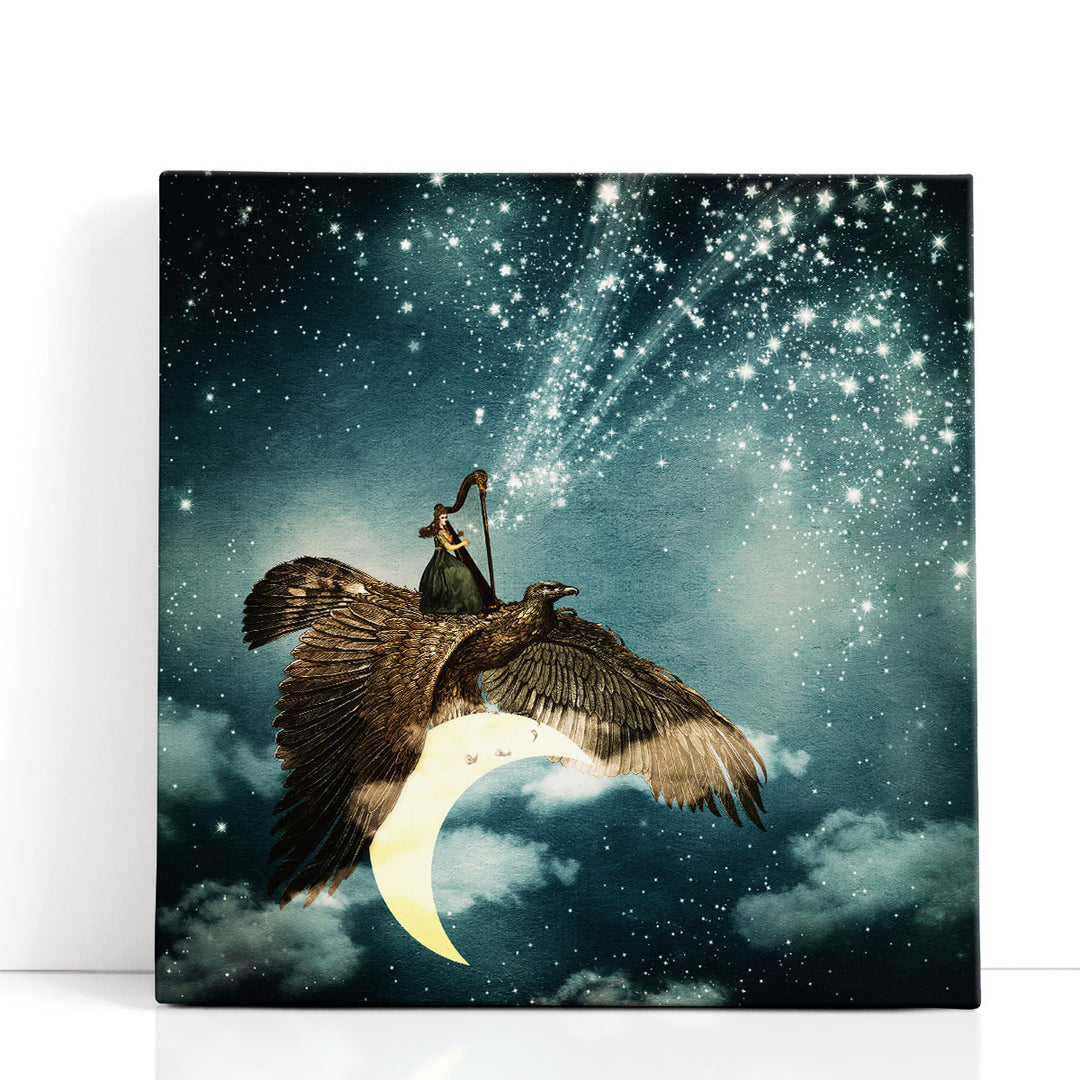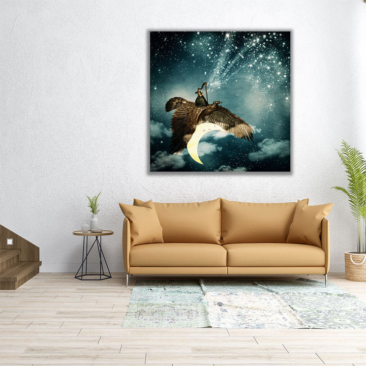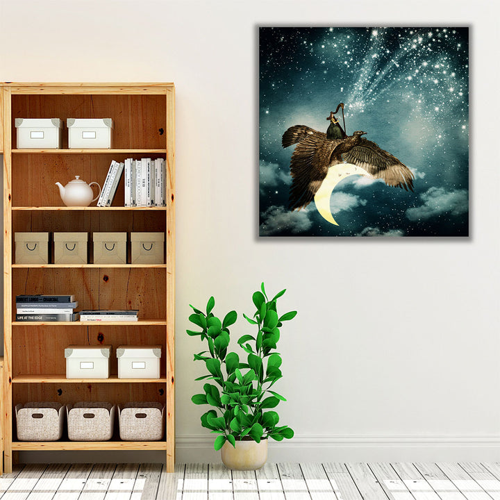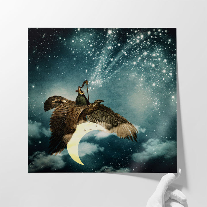This surreal piece features a majestic eagle soaring beneath the moon and stars, merging bird imagery with dreamlike cosmic elements.