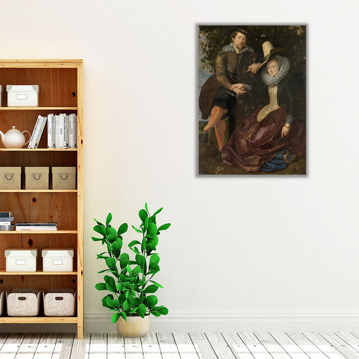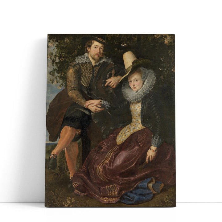 An intimate double portrait capturing a loving couple seated in a lush garden setting, filled with delicate detail and Baroque charm.