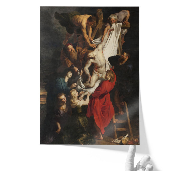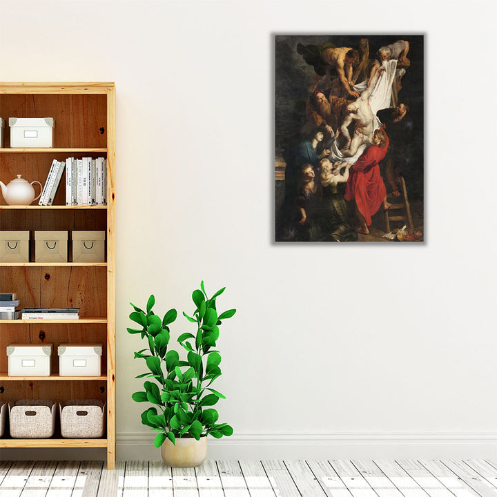 A deeply emotional Baroque scene portraying the solemn moment as Christ’s lifeless body is gently lowered from the cross by his followers.