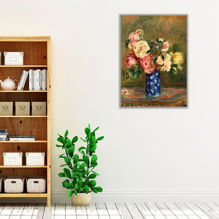 This classic still life features a bouquet of flowers in lush green, blue, and red tones, evoking natural beauty and elegance through Renoir’s touch.