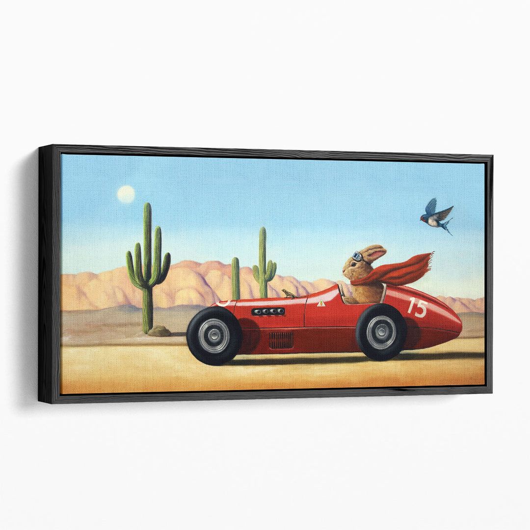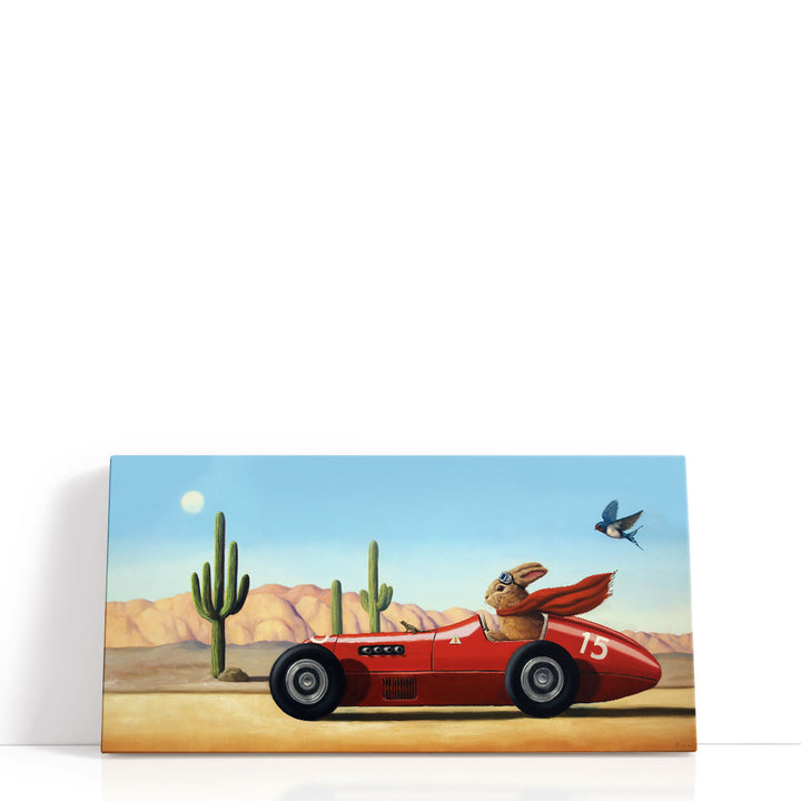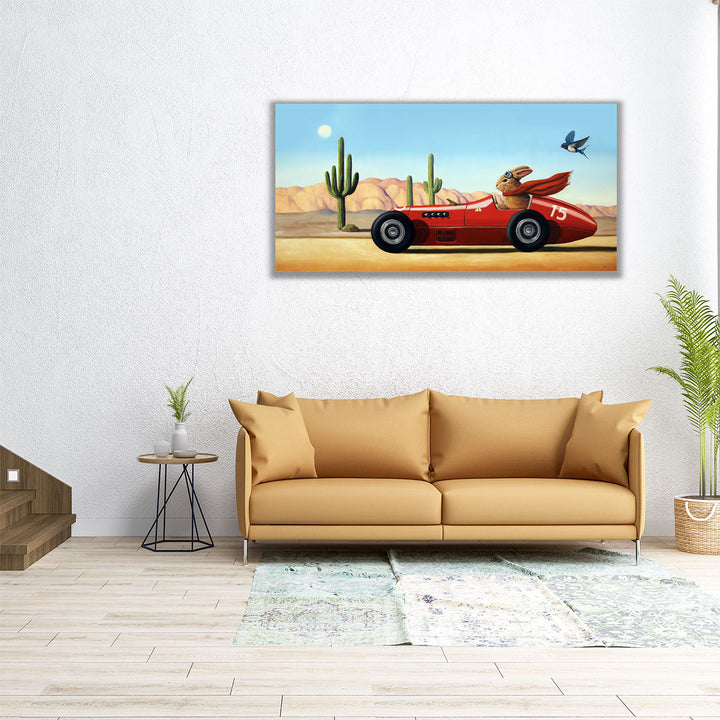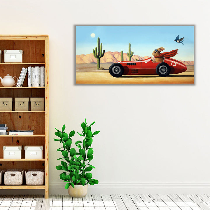 This whimsical desert landscape artwork features a joyful rabbit driving a red car through a sunlit, sandy scene. Blending humor and charm, it’s a delightful addition to any child's room. With soft textures and playful storytelling, it stands out as funny animal prints kids will love. Perfect as large framed children's wall art, this piece is available in sizes up to 60x30 to brighten up nursery or playroom walls.