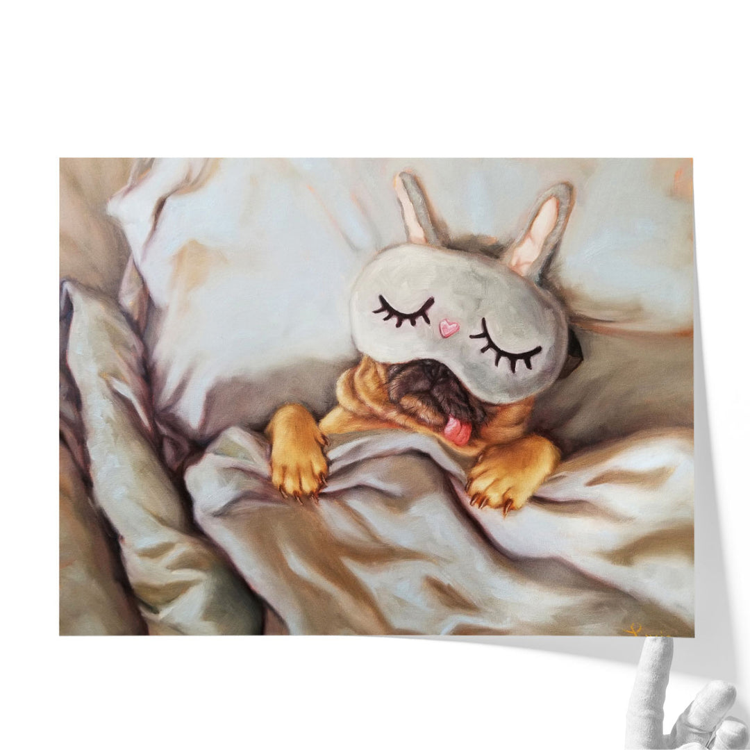 A charming dog sleeps peacefully in its cozy bed, donning an eye mask, blending humor and comfort in a realistic style.