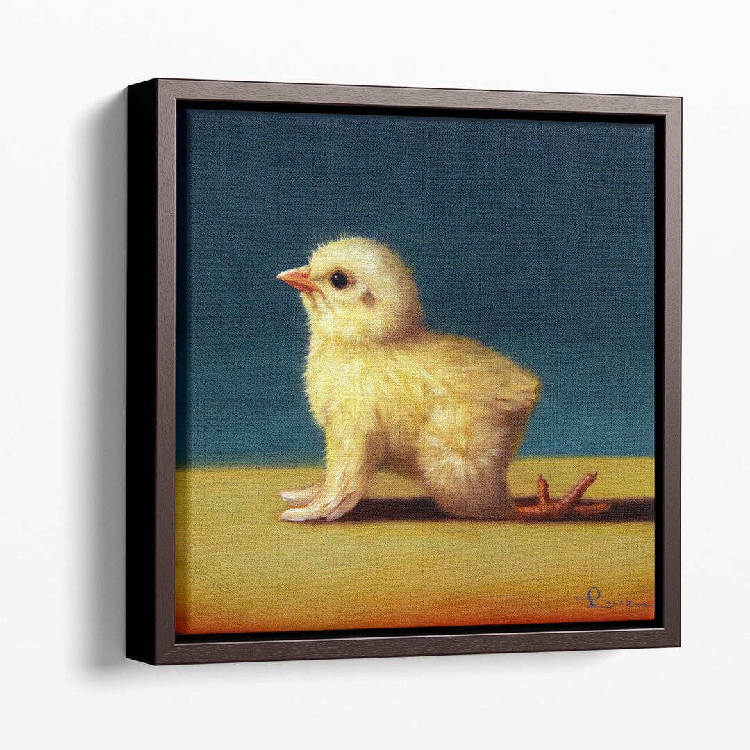 A playful yellow chick strikes a yoga pose against a calming blue background and neutral ground in this quirky and lighthearted modern animal-themed artwork.