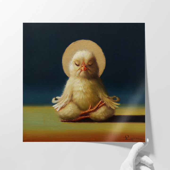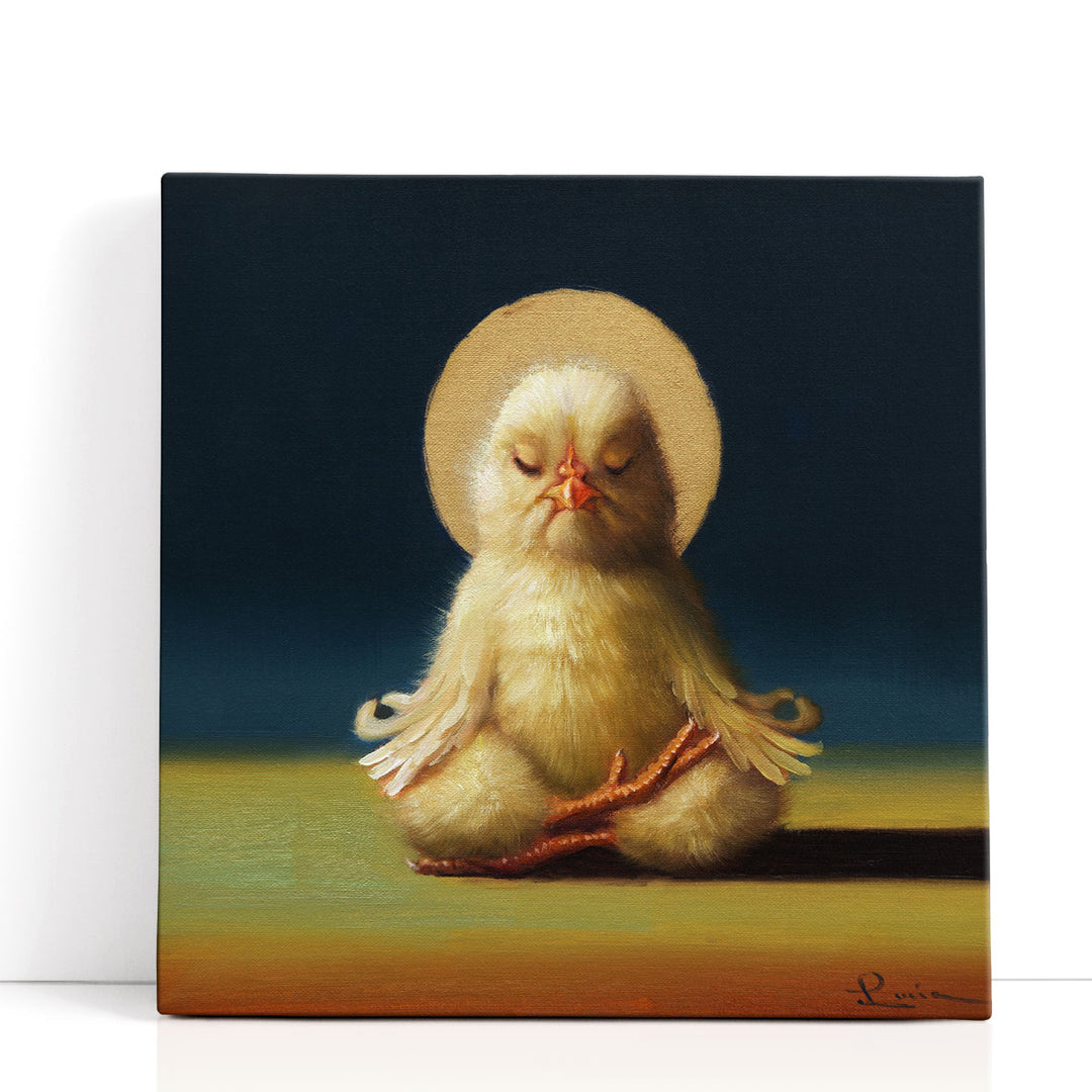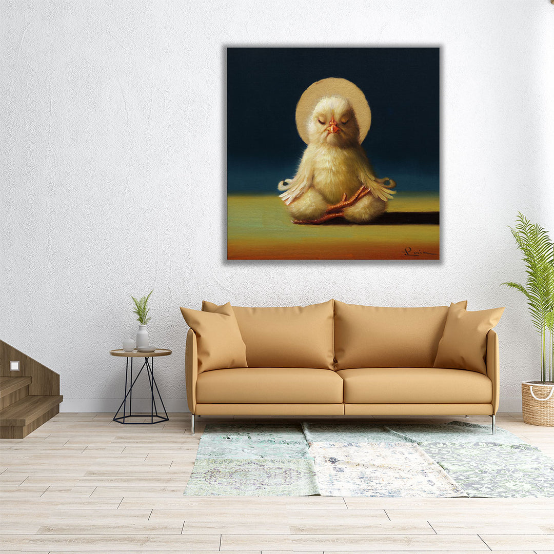 A yellow chick sits in half lotus pose against a blue background, blending whimsy with a neutral ground in a playful yoga-themed style.