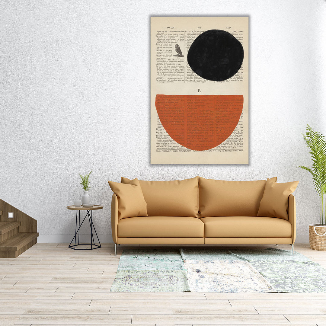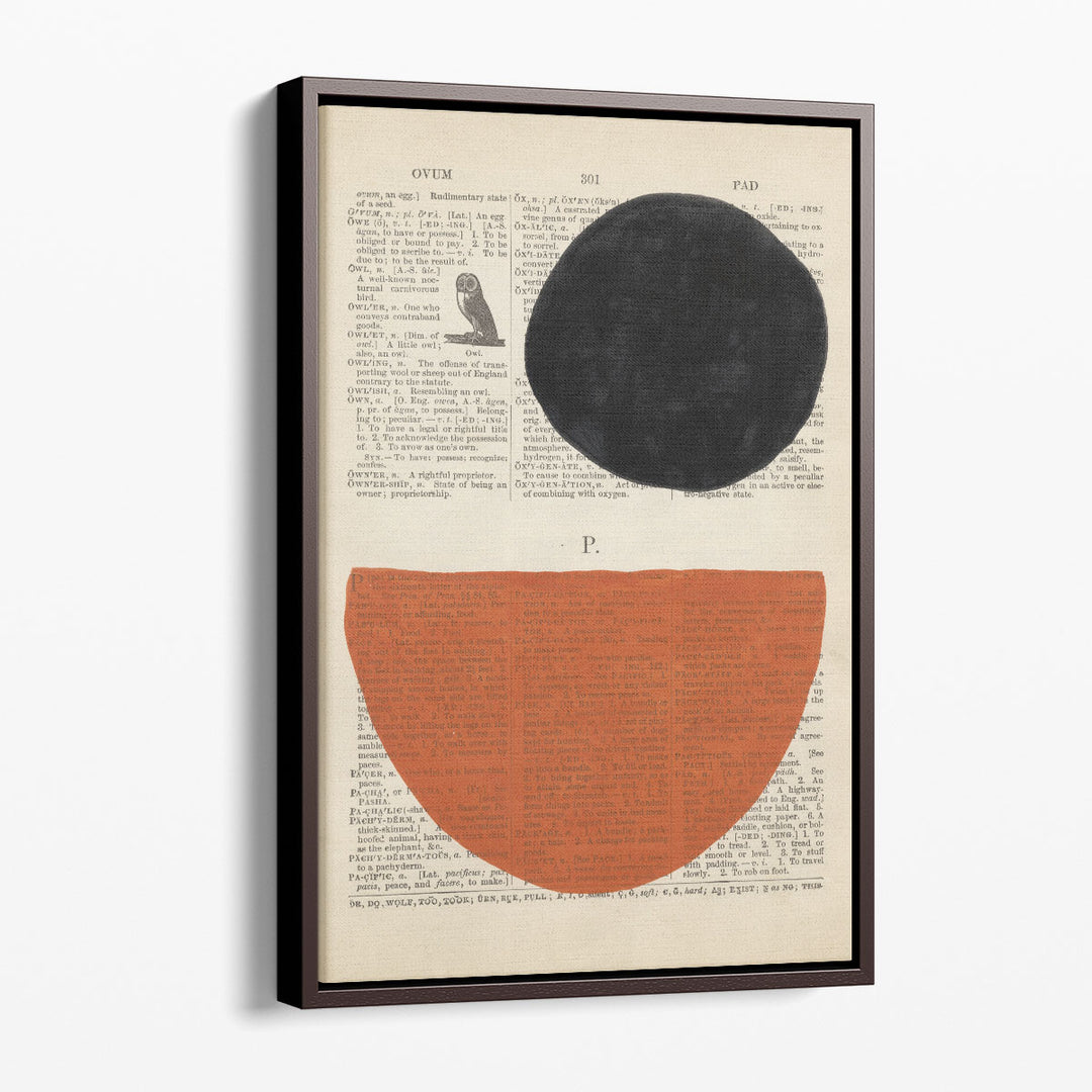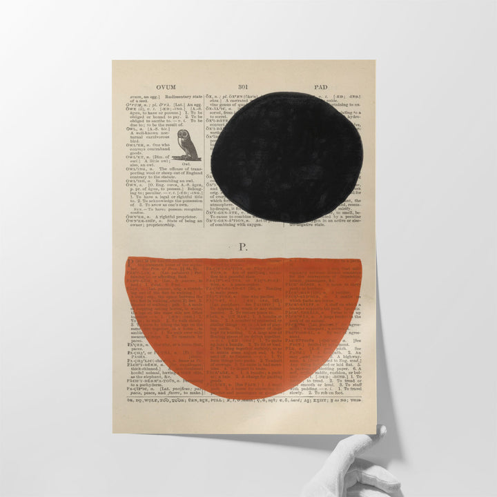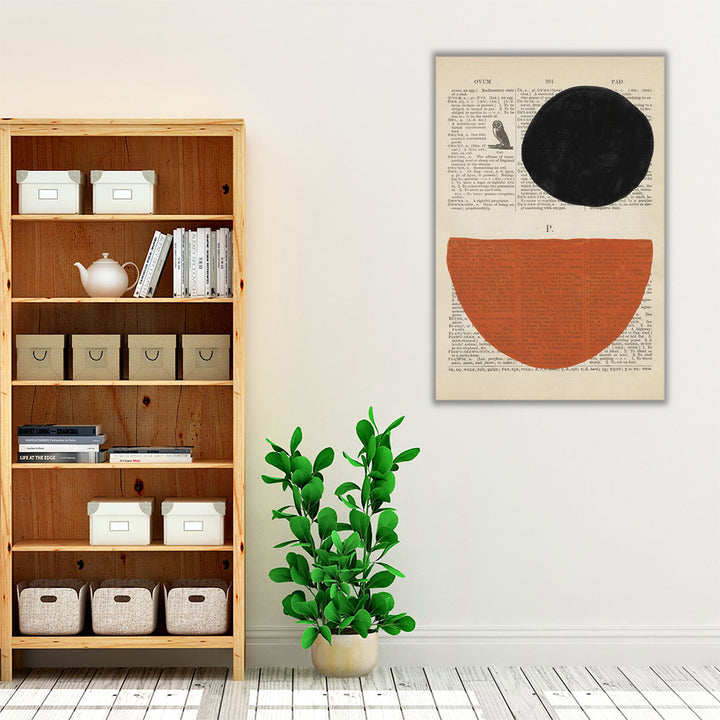 A striking black circle and deep orange semicircle meet on a backdrop of layered text cuttings, creating a balanced yet playful contrast. The structured geometric design draws the eye, while the muted tones make it easy to style. Ideal for modern interiors, this piece connects Abstract Artwork, Geometric Wall Decor, and Hallway Prints in an artistic flair.