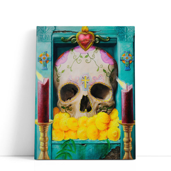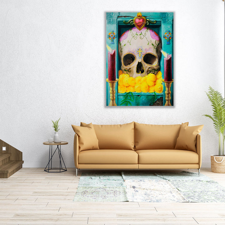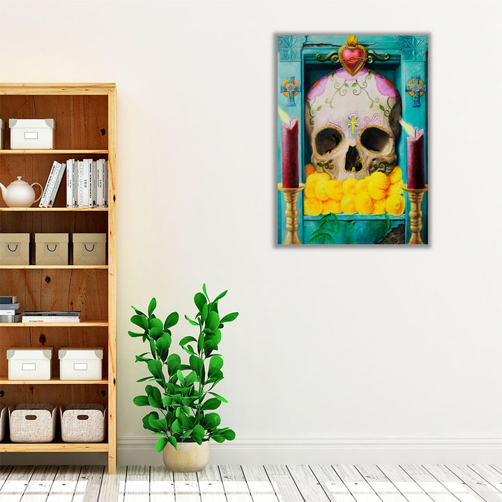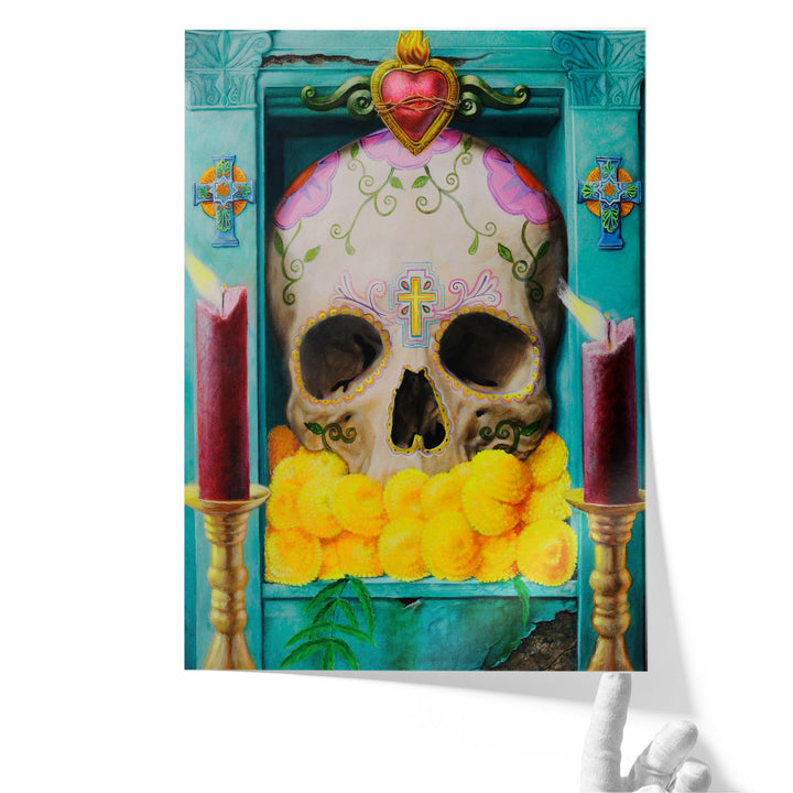 Vivid strokes breathe life into a skull-themed horror piece infused with pop art style, occult elements, and a bold, colorful palette.