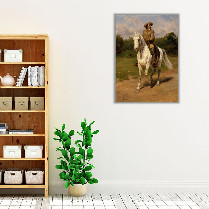 A classic scene showing a man on a white horse, surrounded by green trees and earthy brown ground, captured in a neutral-toned setting.