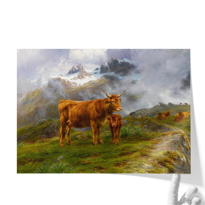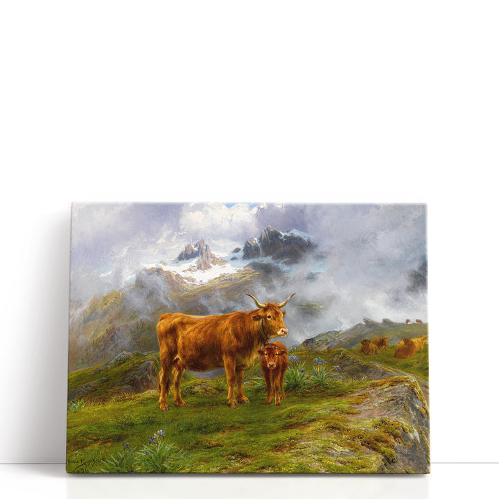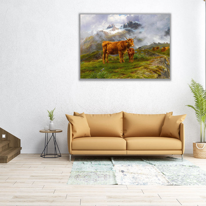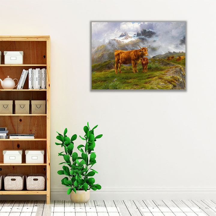This classic scenic artwork captures brown cattle in a mountainous setting, enriched with green hues and a soft neutral-toned background.