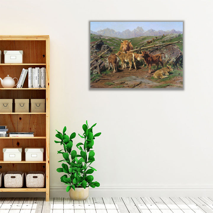 This classic scenic artwork features calves in a tranquil rural setting, painted in earthy browns, fresh greens, soft blues, and calming neutral tones.