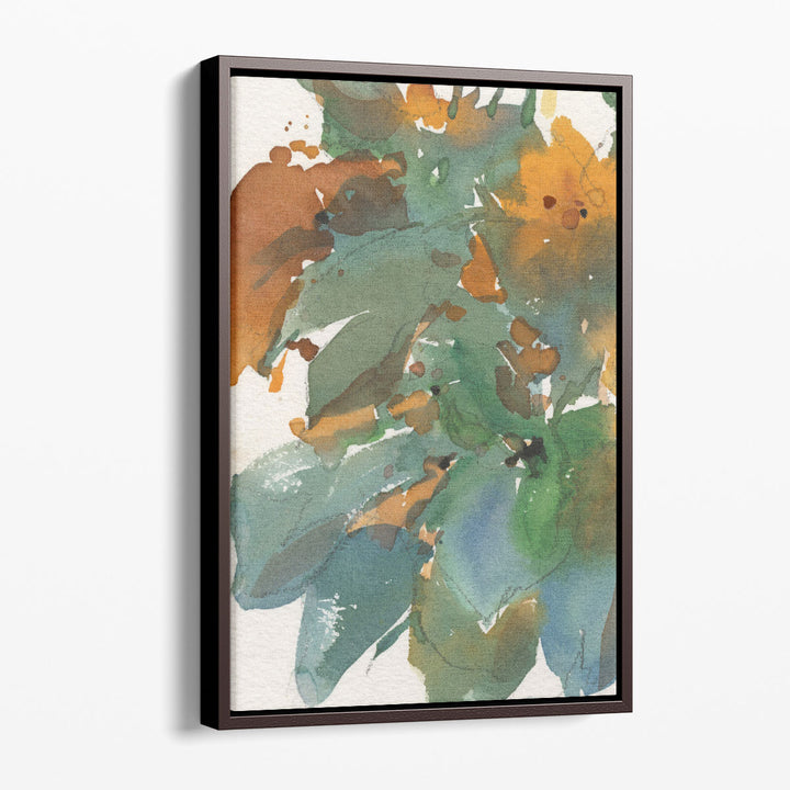 A vibrant watercolor depiction of floral and nature elements showcases orange and green hues, beautifully highlighting flowers and leaves.