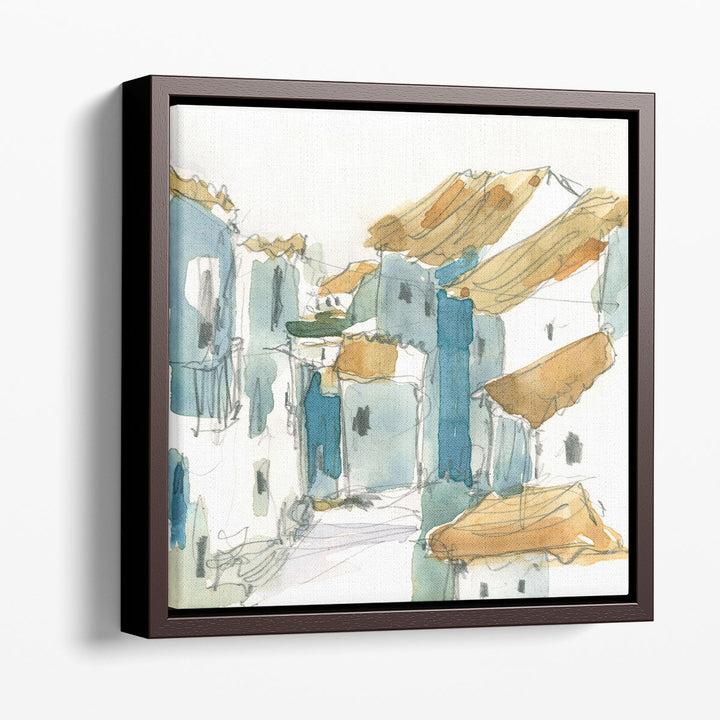 Capturing a view of charming architecture, this artwork beautifully highlights traditional houses and vibrant colors.