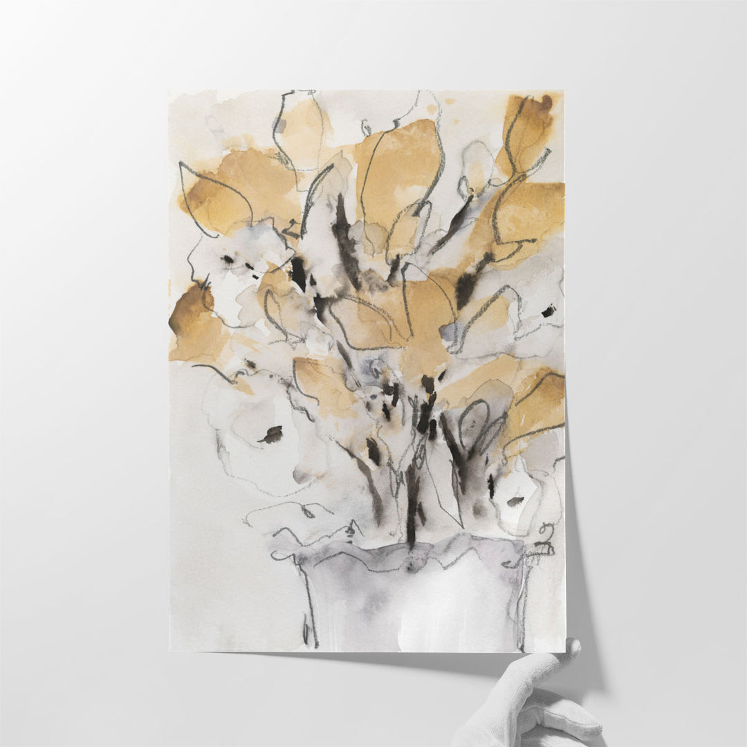 This captivating artwork features a still life of vibrant poppies in black, white, and brown vase, beautifully showcasing the essence of seasonal beauty.