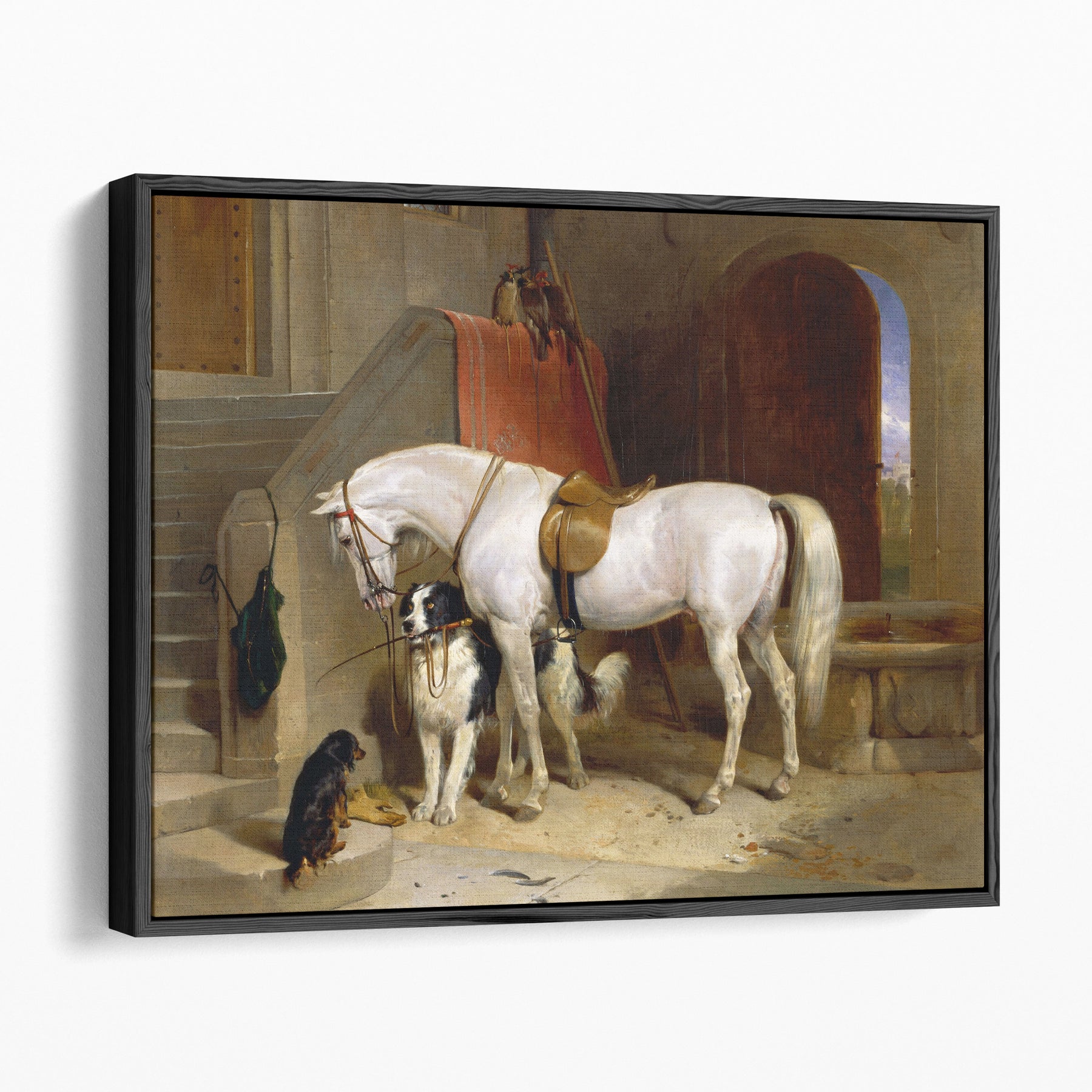 This stable scene captures a majestic white horse with two attentive dogs, rendered in Landseer’s refined and realistic equestrian style.
