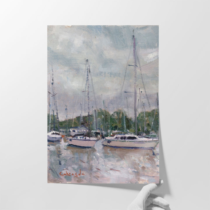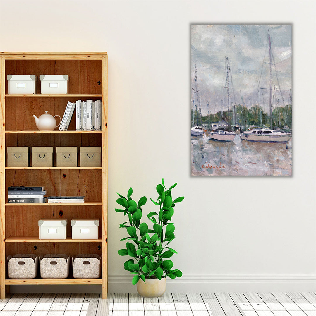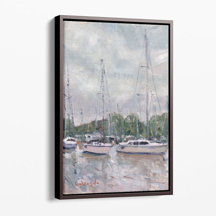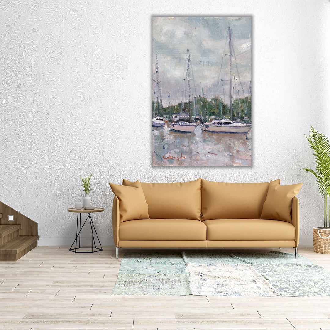 This nautical artwork beautifully captures boats gently swaying in the harbor, evoking a serene coastal charm.
