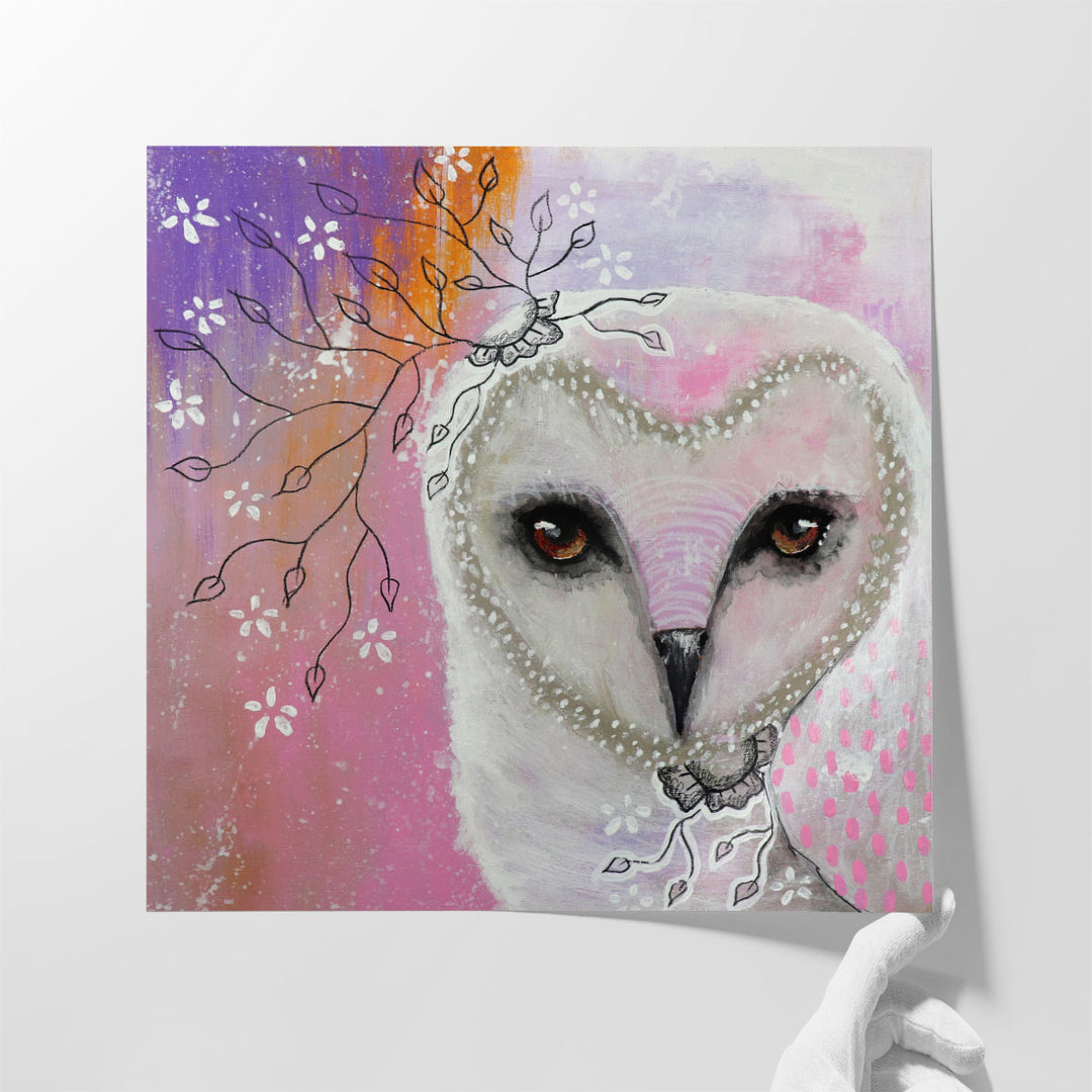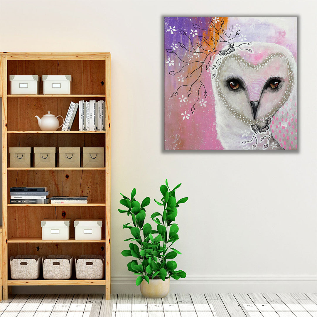 A white owl rests against a neutral background, capturing quiet elegance in this serene, nature-inspired piece.
