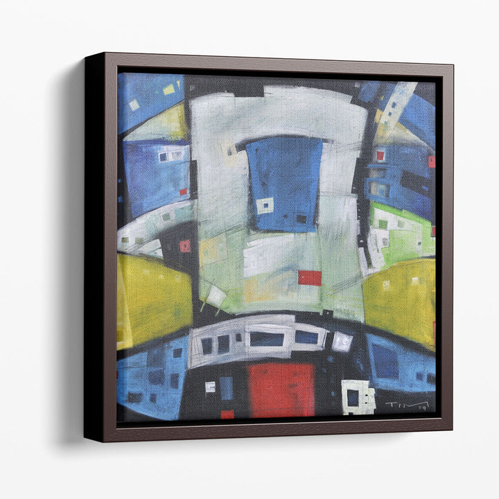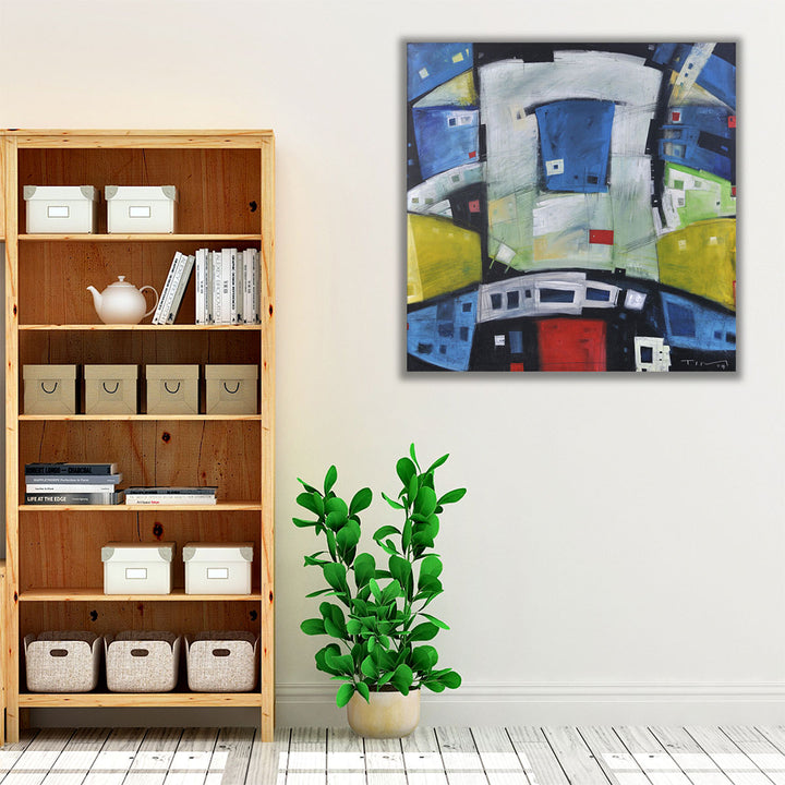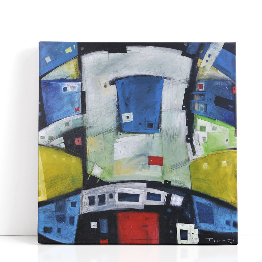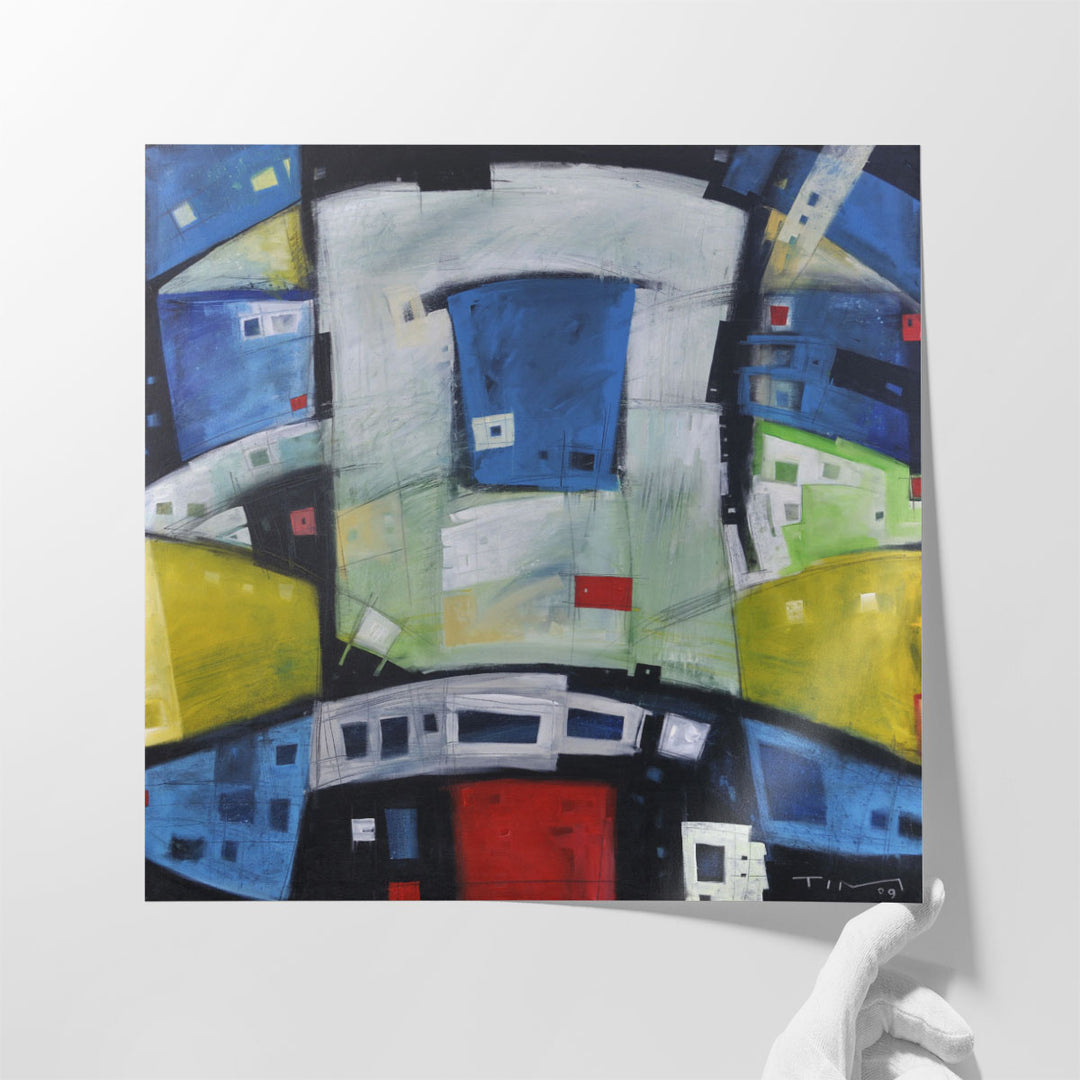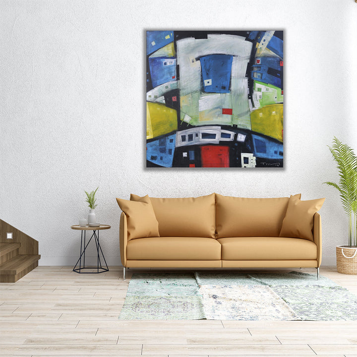 Bold geometric shapes in blue, white, and yellow bring abstract energy to this modern art style composition.