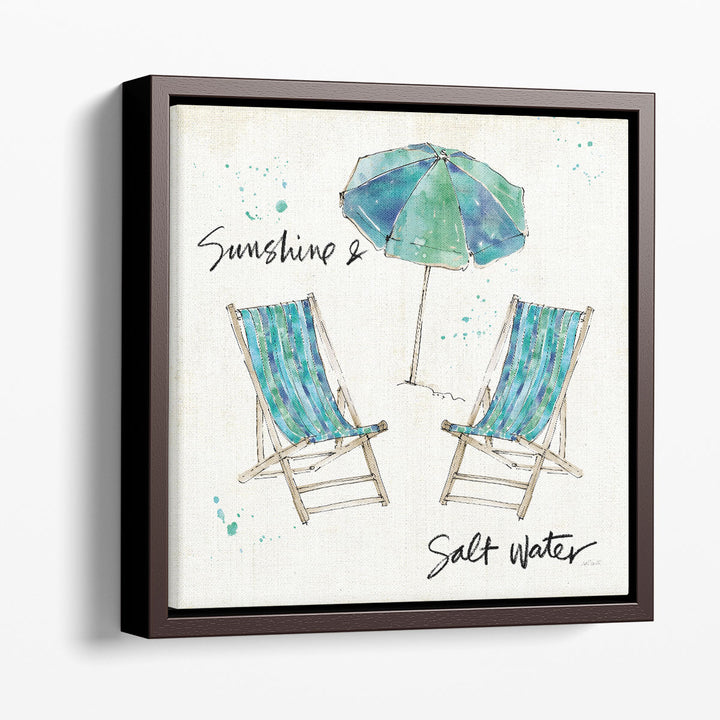 This vibrant artwork features blue beach chairs under an umbrella with "sunshine and saltwater" text, evoking relaxation and beach vibes.