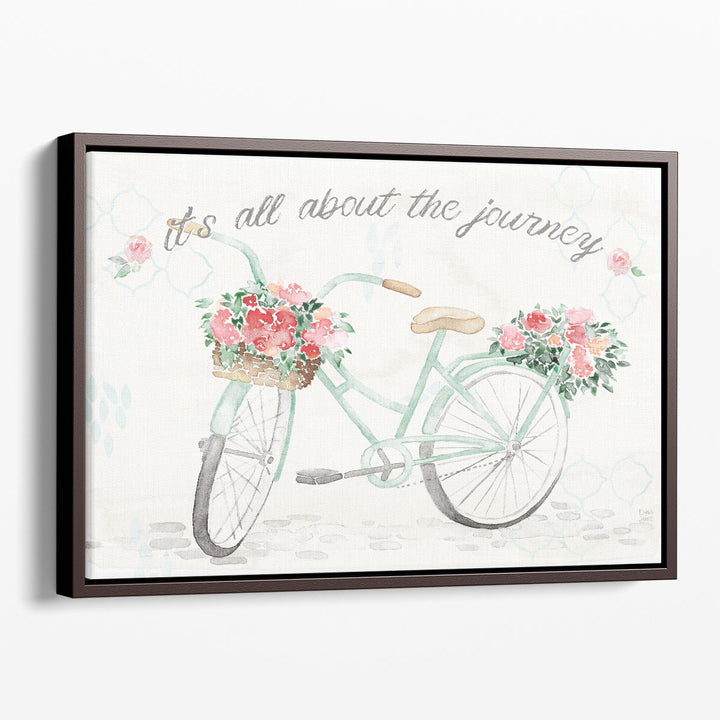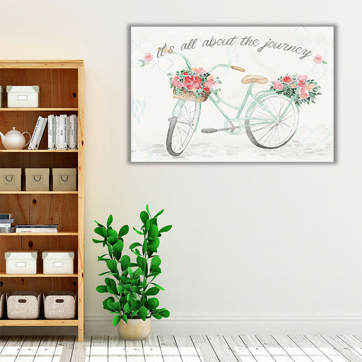 This vibrant piece showcases a charming bicycle adorned with flowers, combining transportation and typography for a stylish, bohemian feel.