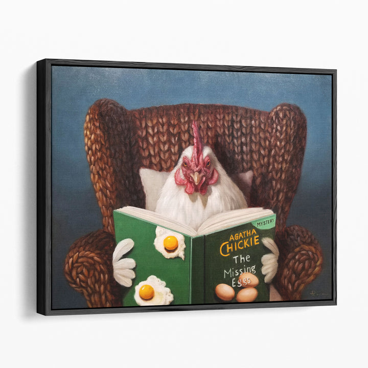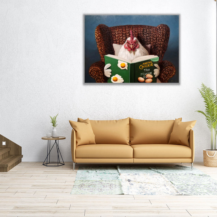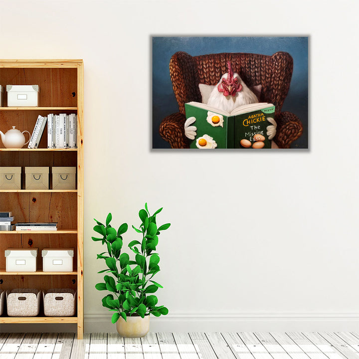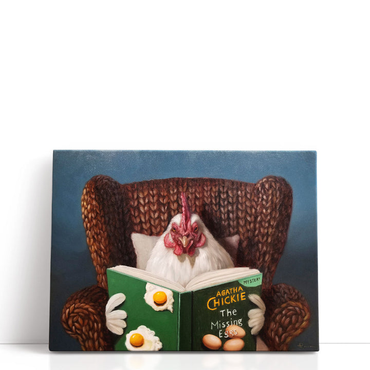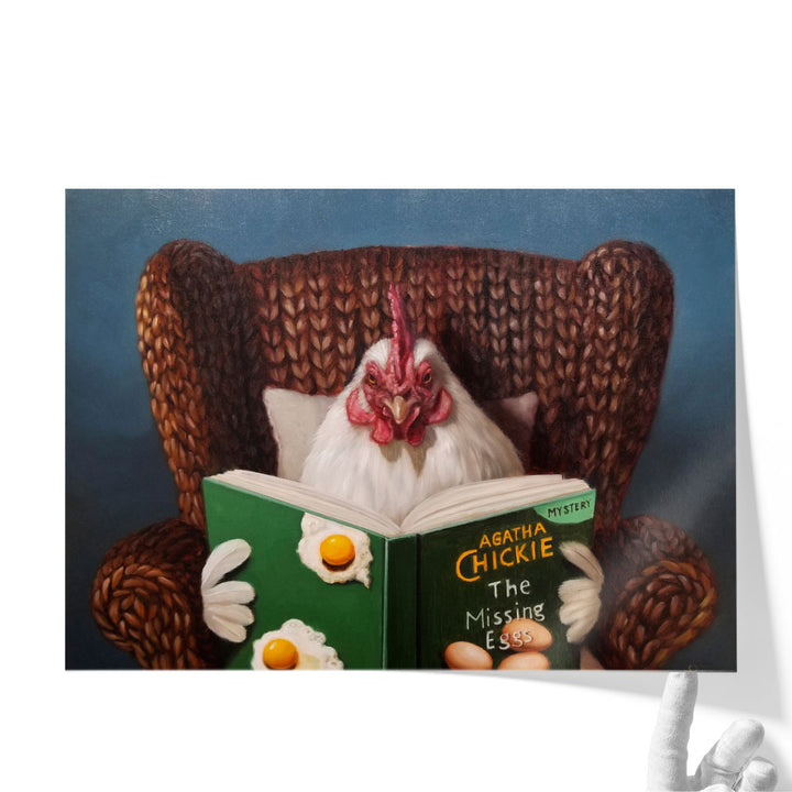 A humorous portrayal of a chicken reading a book, this artwork blends charm and whimsy in a playful, illustrative style.