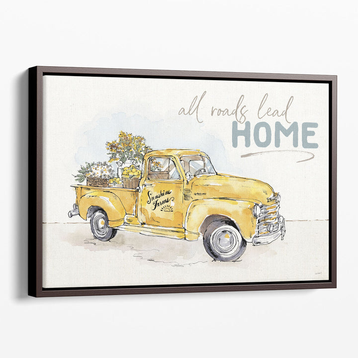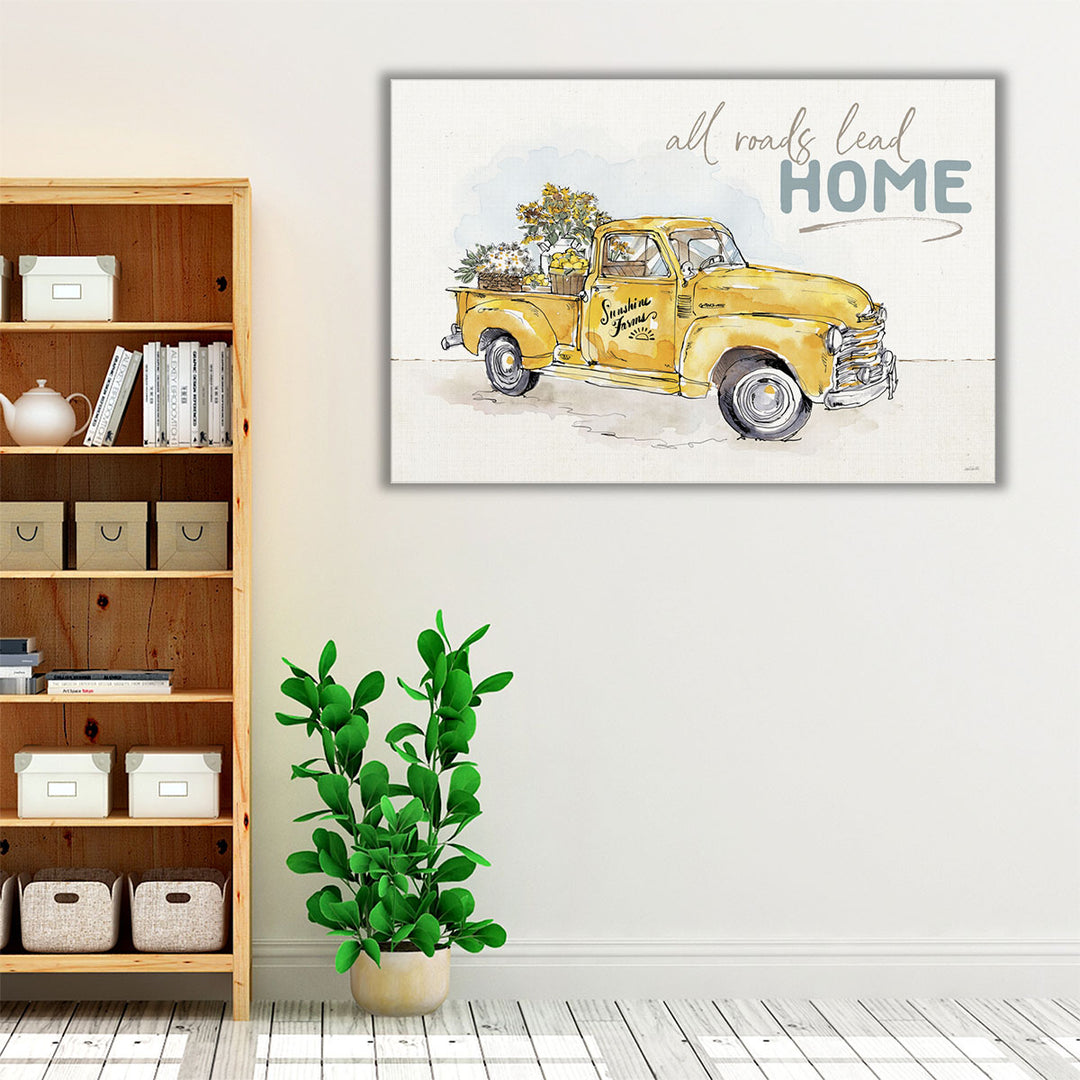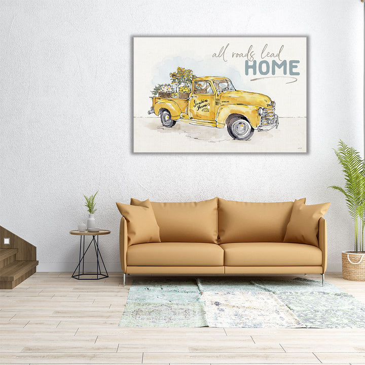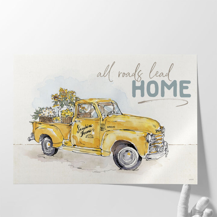 This delightful art piece features a yellow farm truck with plants and flowers, accompanied by the "All Roads Lead Home" text, evoking a rustic, welcoming feel.