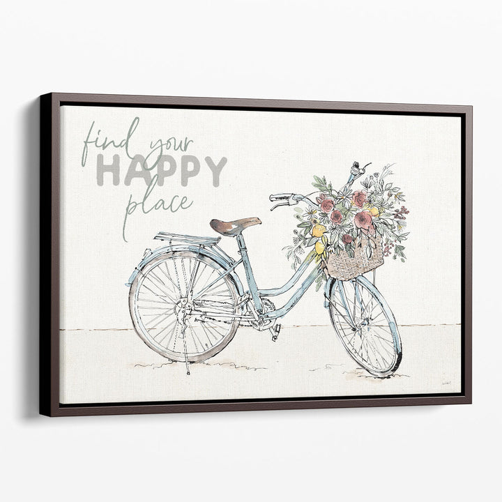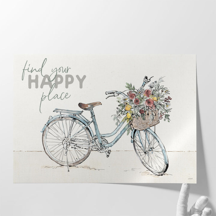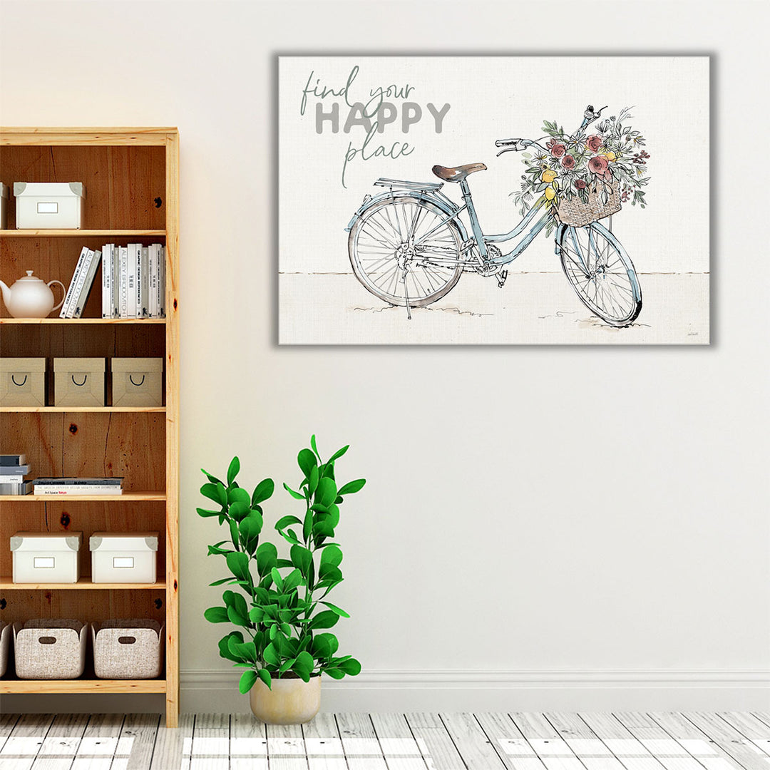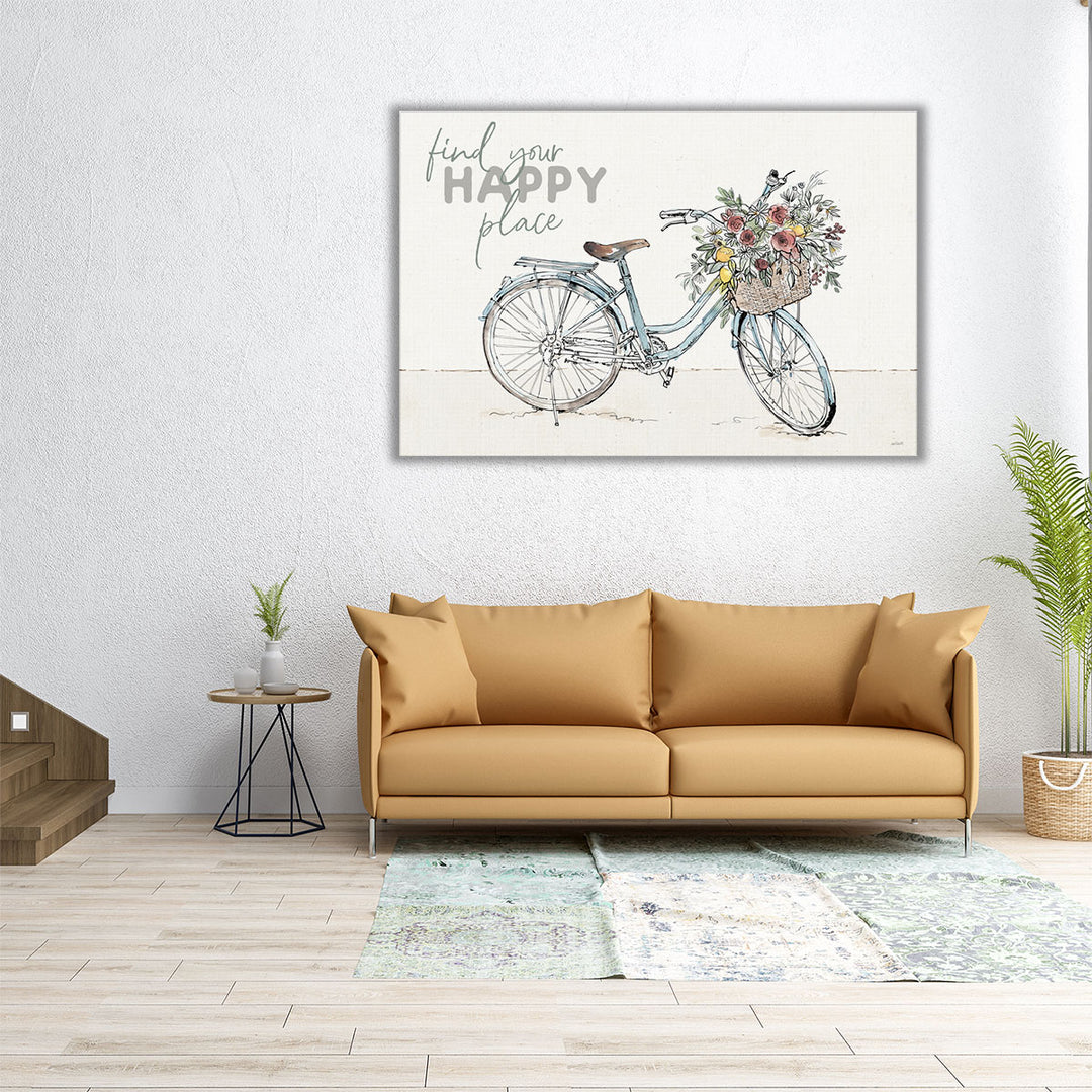 This whimsical design features the inspiring message "Find Your Happy Place" alongside a bicycle adorned with flowers, perfect for creating a joyful atmosphere.
