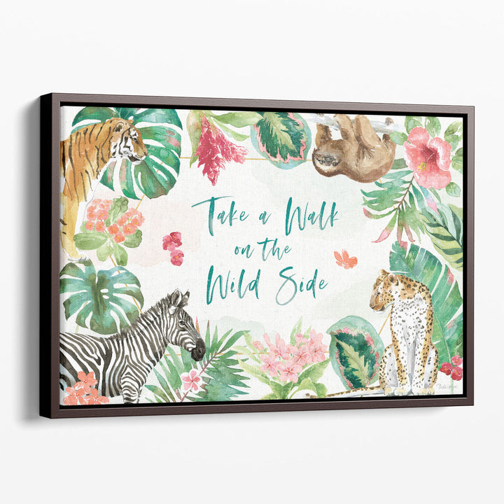 This vibrant piece combines floral and typography elements with tropical leaves, creating an enchanting atmosphere that brings a touch of the jungle to your decor.