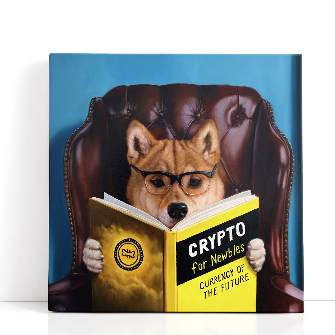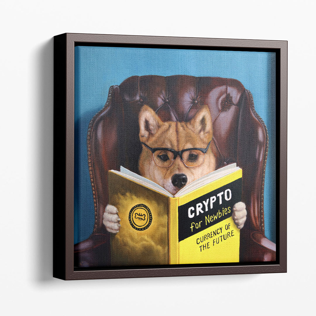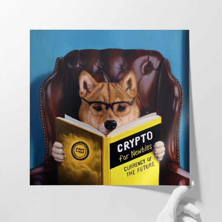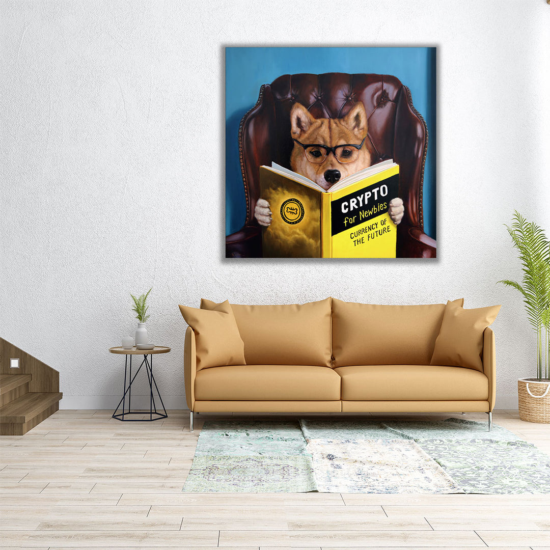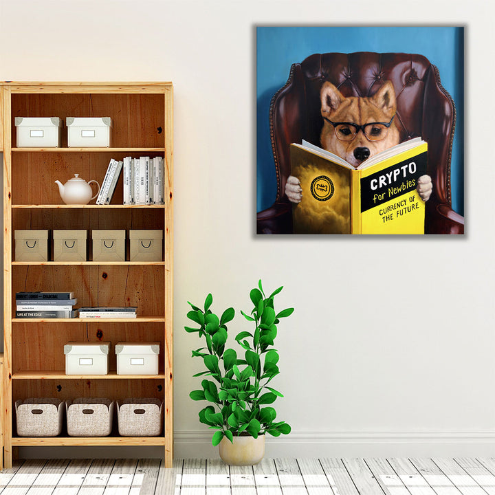 A humorous scene in a realistic style featuring a dog sitting on a brown chair, deeply immersed in reading a book.