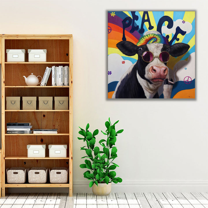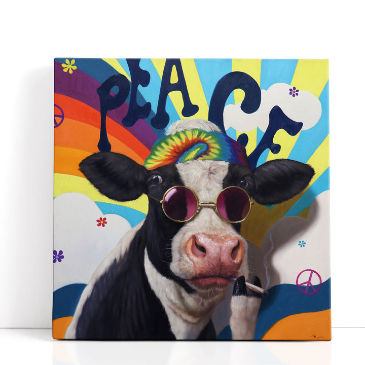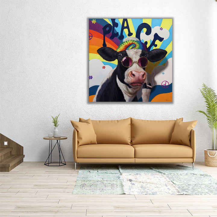 A whimsical cow takes center stage in this colorful, typography-inspired artwork, reflecting a playful blend of humor and charm by artist Lucia Heffernan.