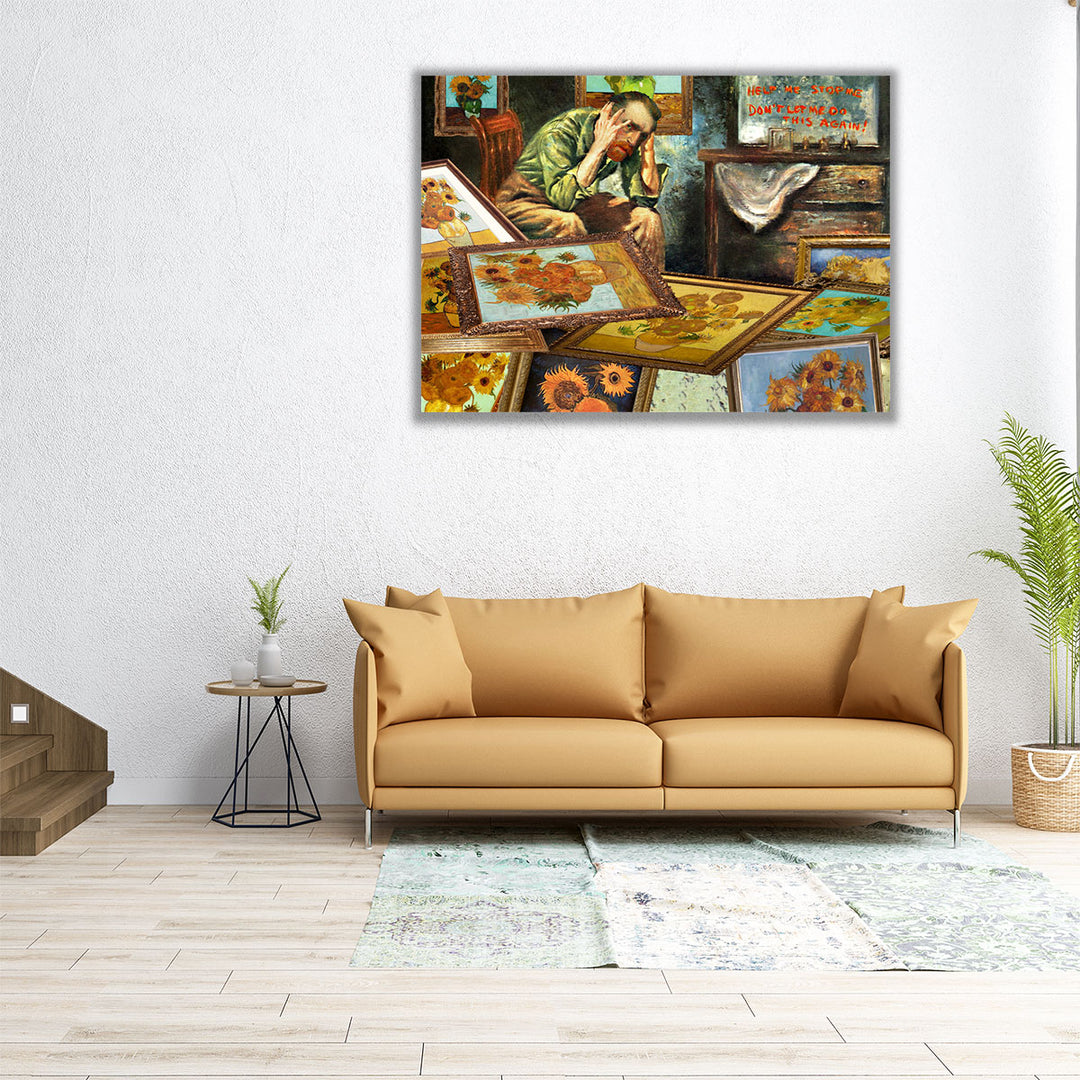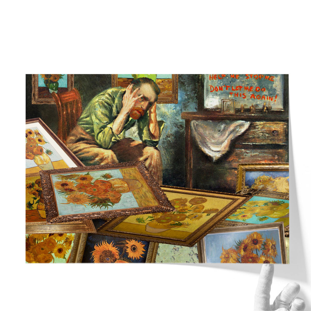 This artwork features a man surrounded by scattered paintings, blending surreal elements with a touch of humorous storytelling.