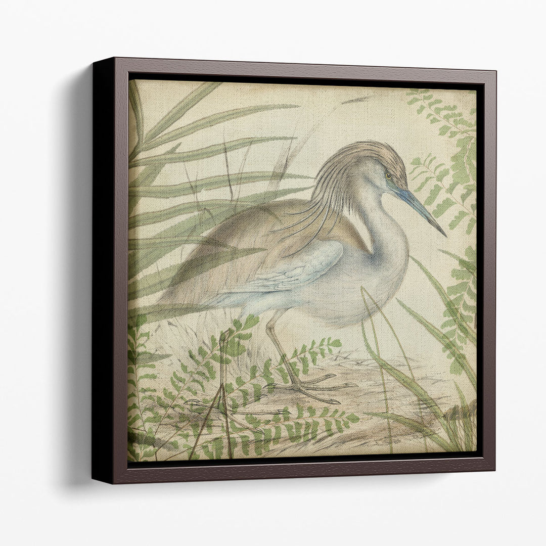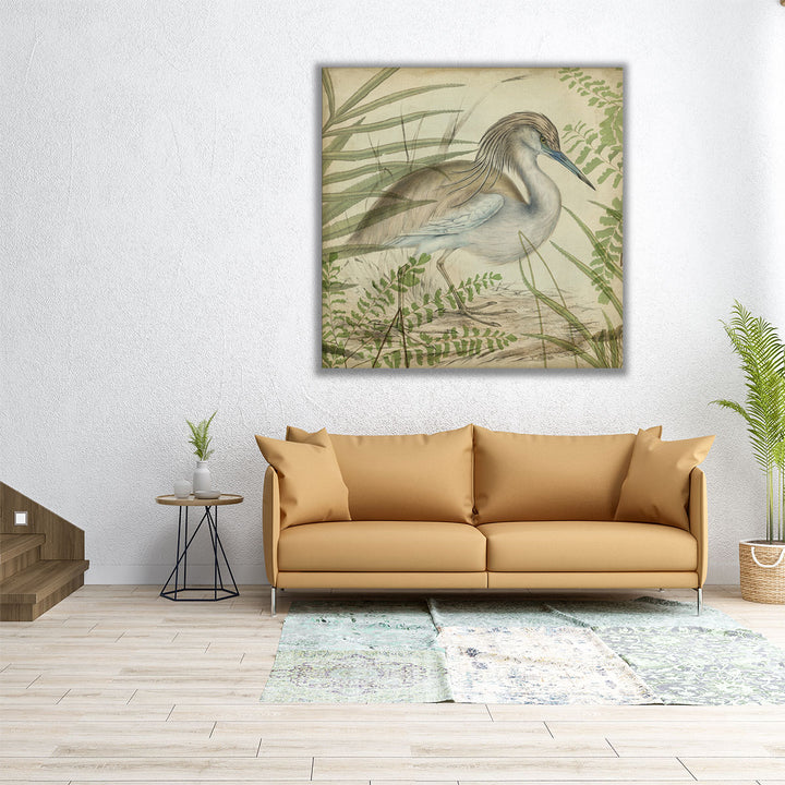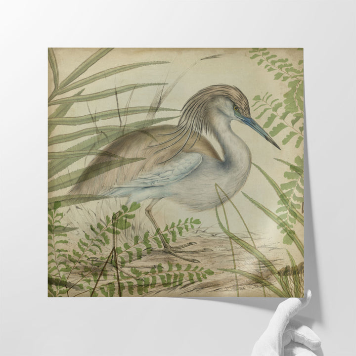 This neutral bird-inspired art print adds a tranquil touch to any space, featuring a serene heron surrounded by lush ferns in a delicate design.