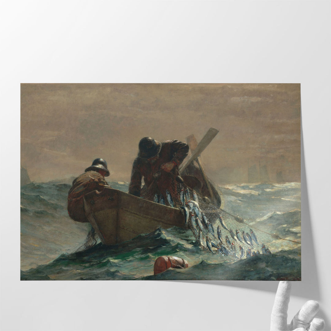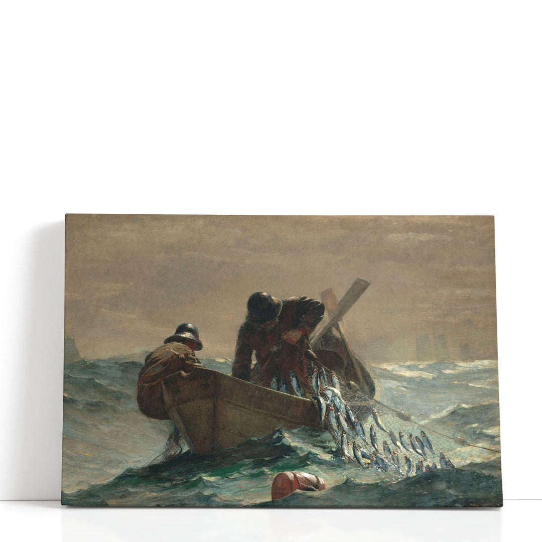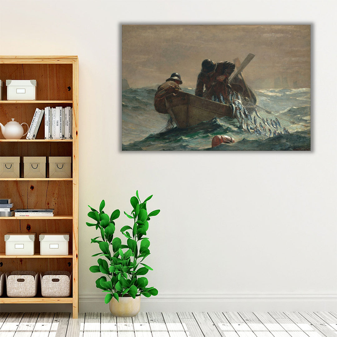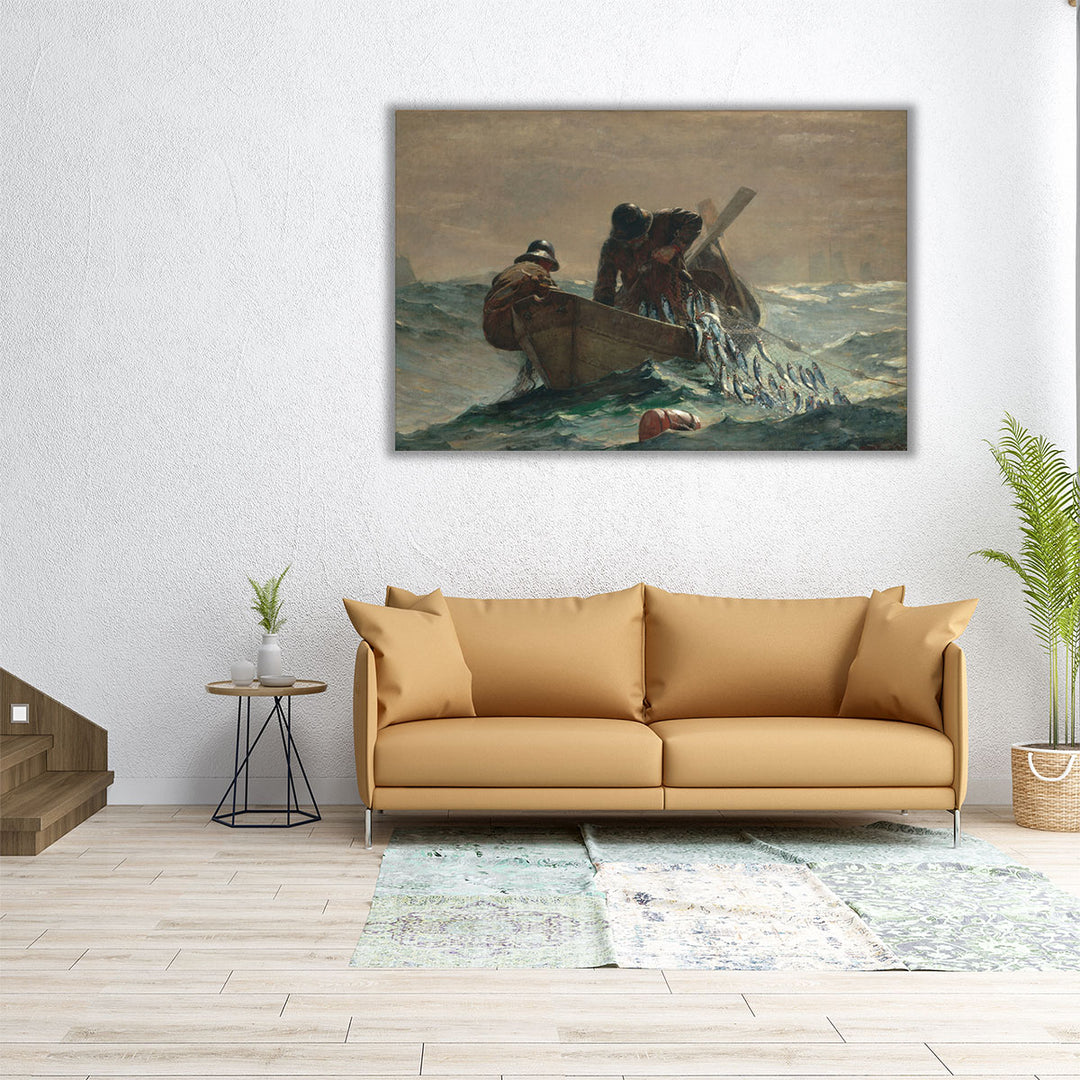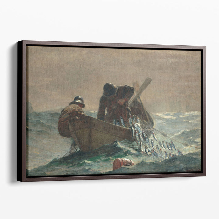 A classic coastal scene where fishermen haul their net filled with fish, set against muted brown and neutral tones aboard a sturdy wooden boat.