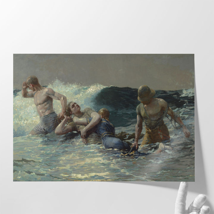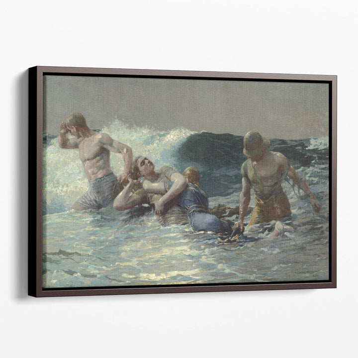 People facing the strength of the ocean are captured in a classic scene with a neutral palette that evokes calm and timeless intensity.