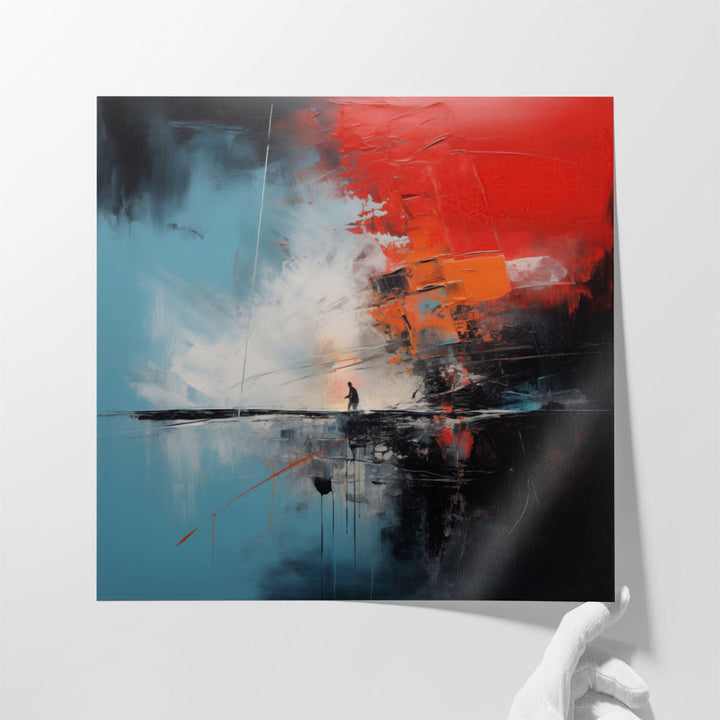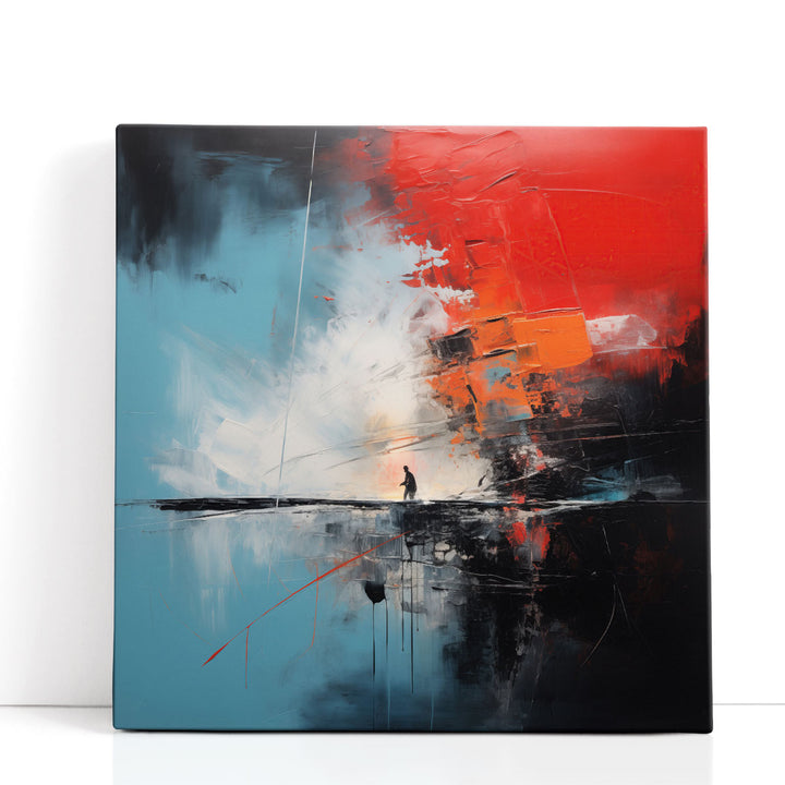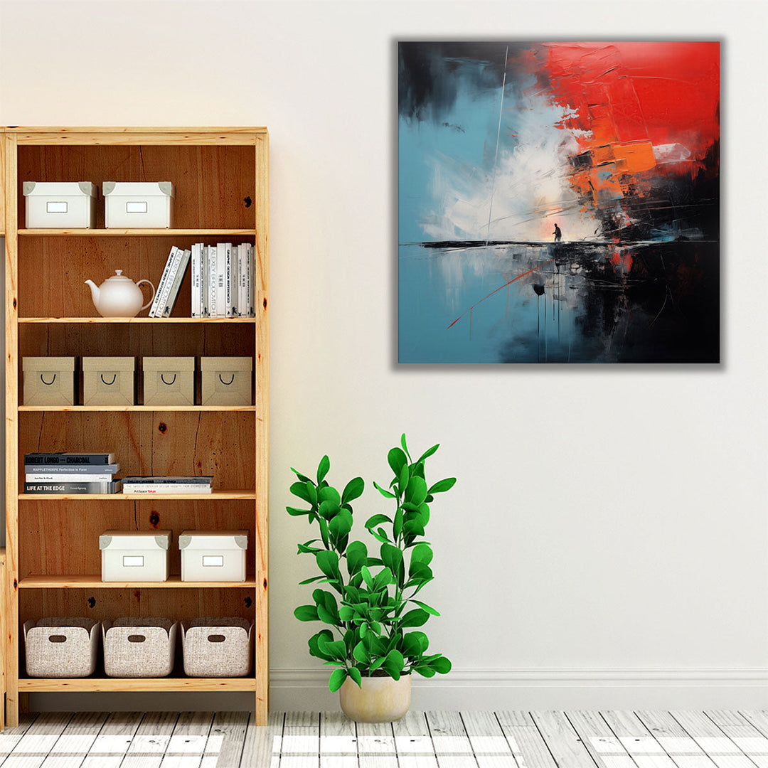 A bold abstract piece highlighted by vibrant red tones, perfect for decor.
