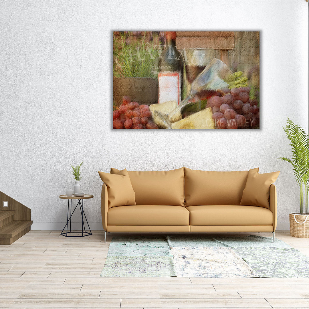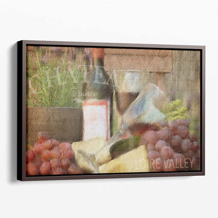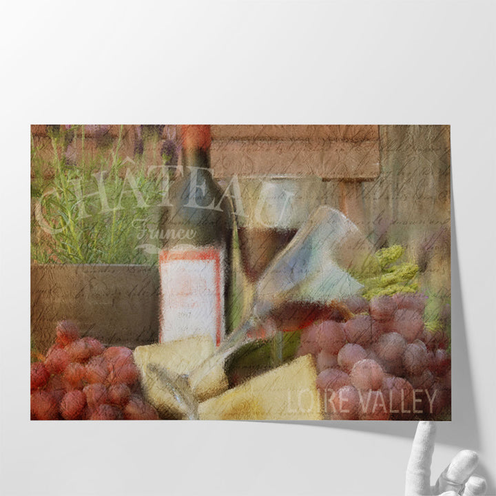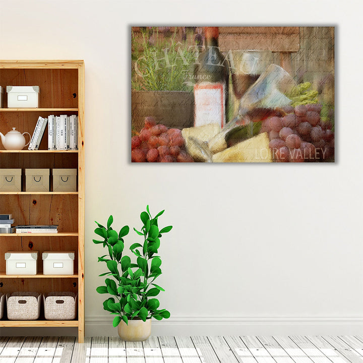 An abstract composition highlighting grapes and a wine bottle with a glass comes alive through earthy browns and neutral hues that evoke a refined dining ambiance.