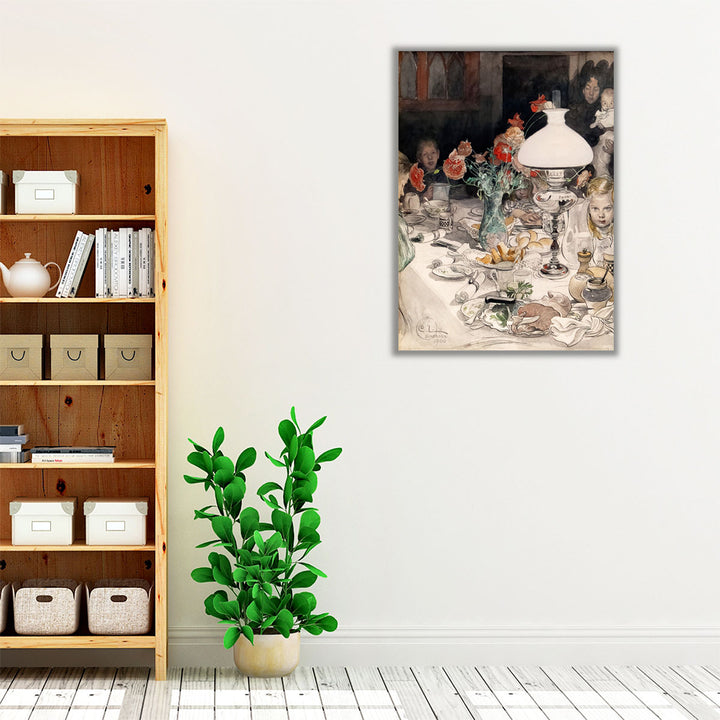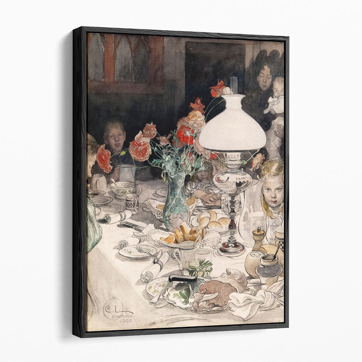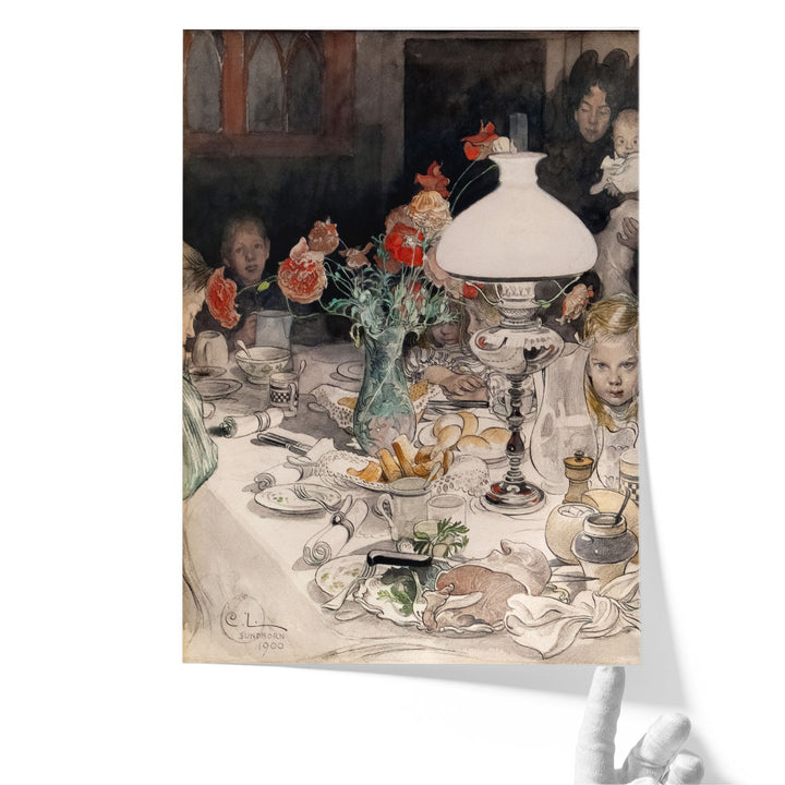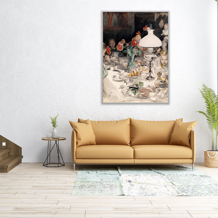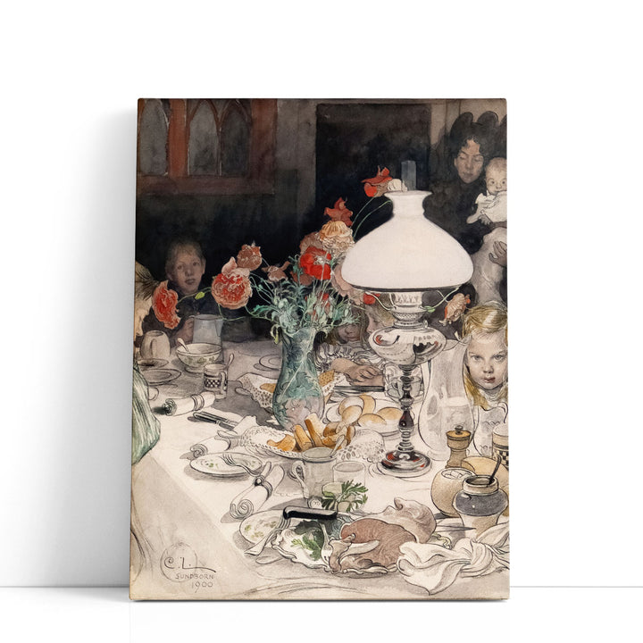 Convivial dining as people gather around food beneath a glowing lamp, capturing evening warmth and shared ritual with inviting, domestic detail.