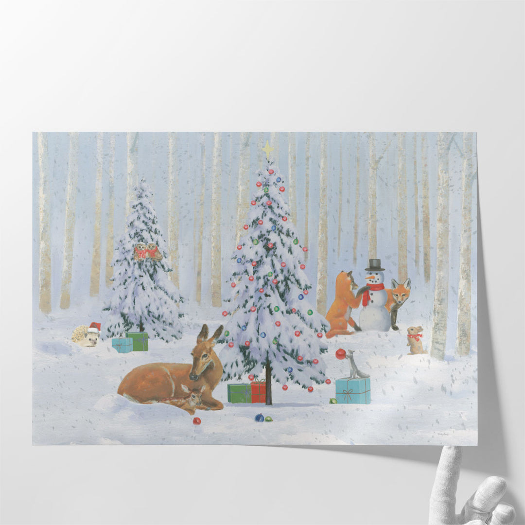 This charming artwork captures a festive scene of foxes and deer celebrating Christmas among snowy trees, bringing holiday cheer with its delightful animal theme.