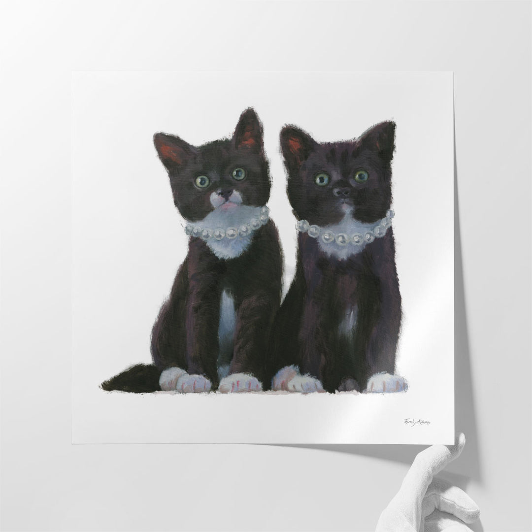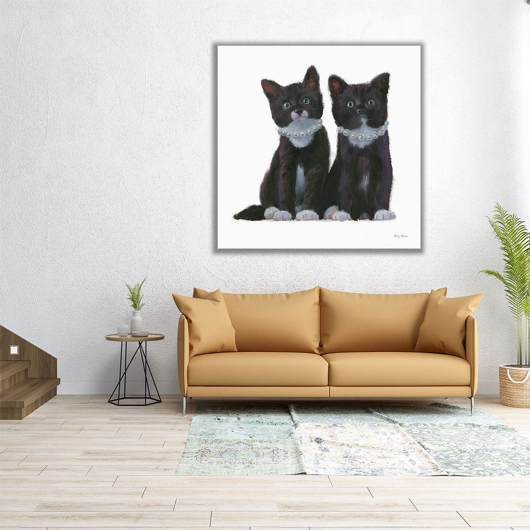 This charming art piece features a portrait of two black cats, capturing their playful and endearing nature with a sophisticated black and white style.