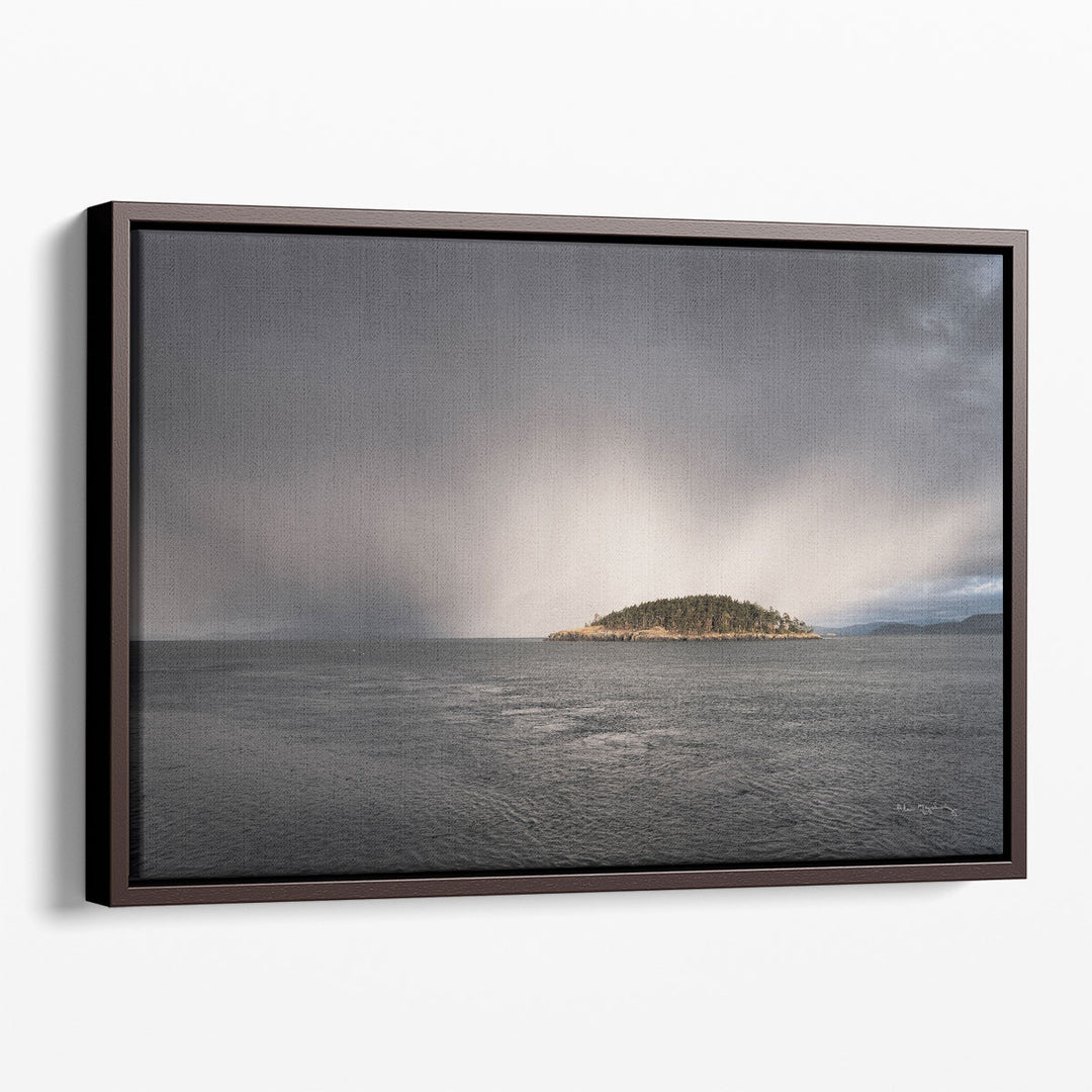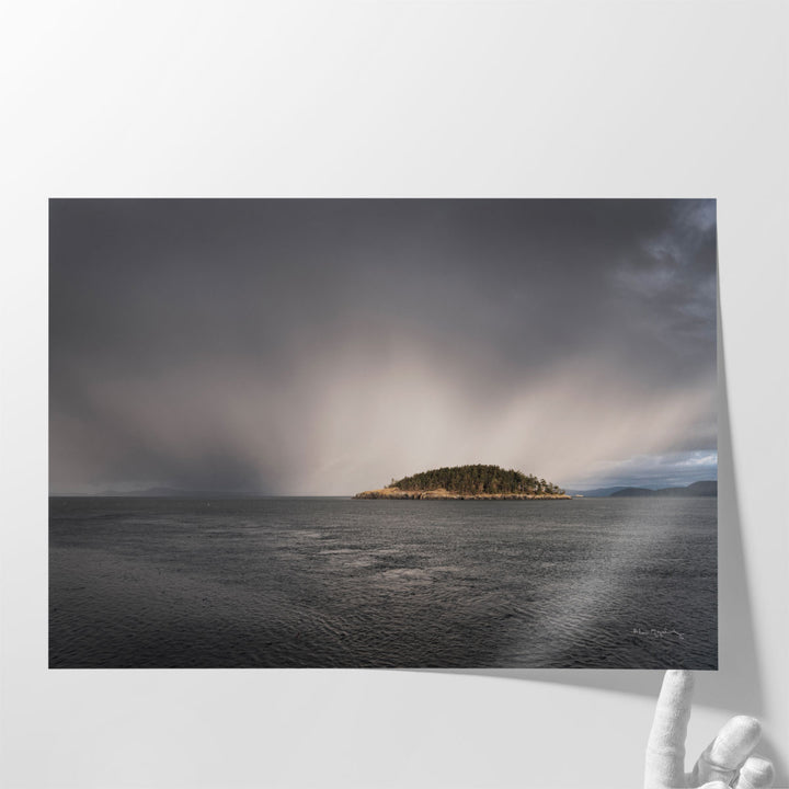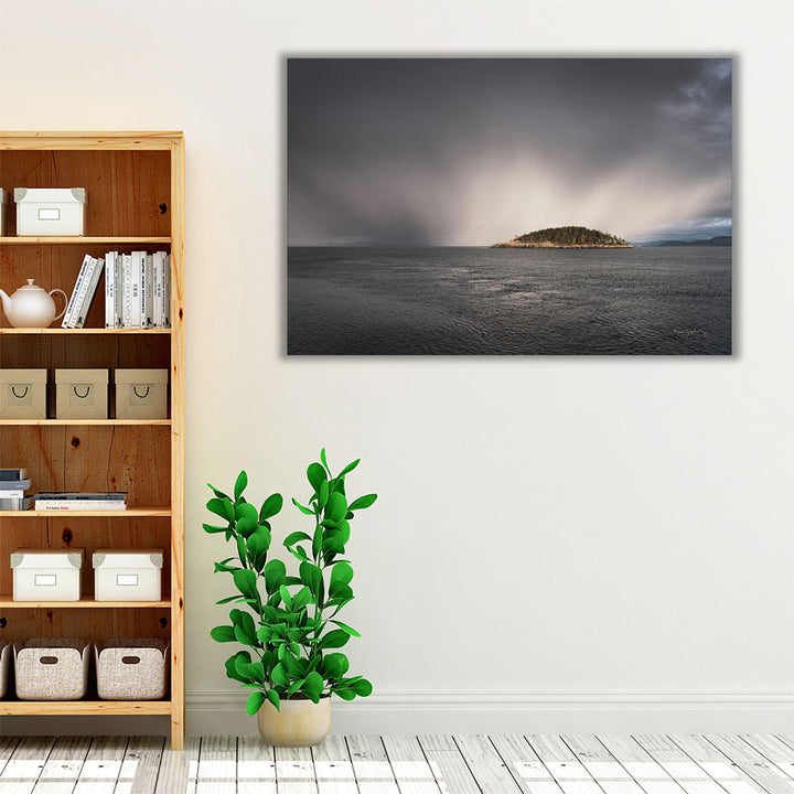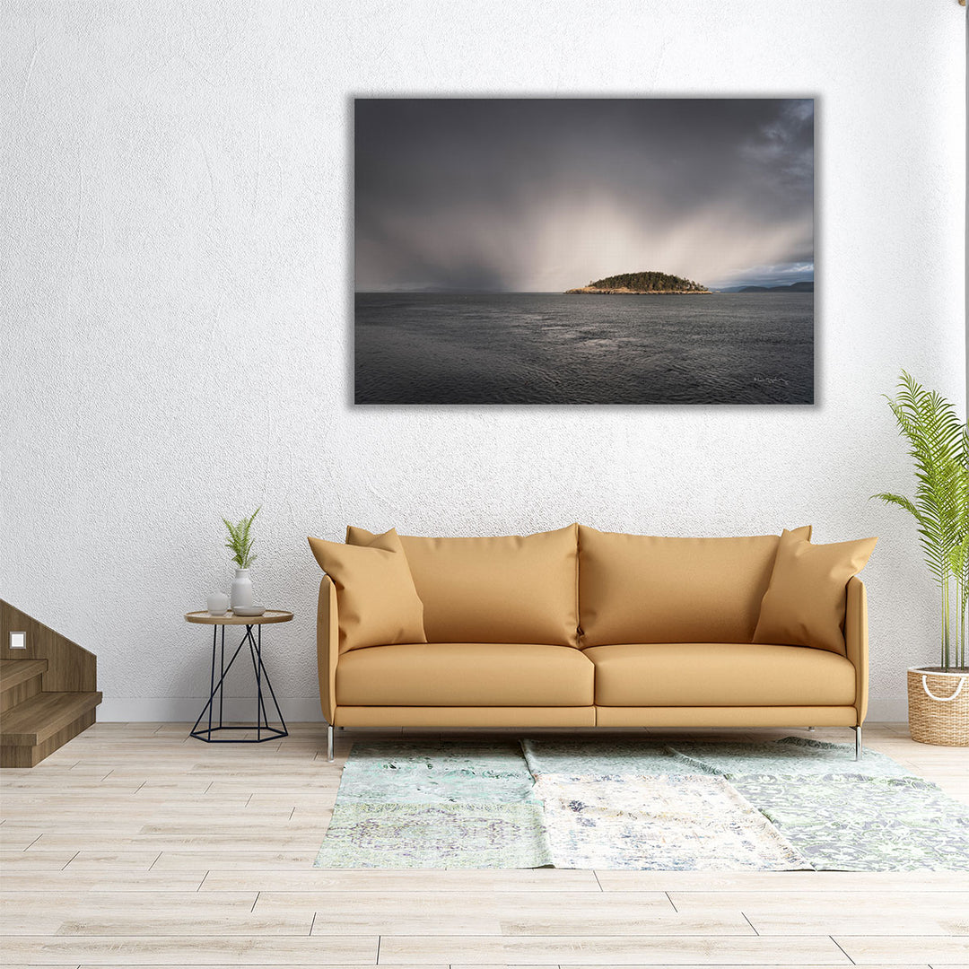 This striking photography piece showcases a scenic gray-toned view of an island surrounded by water, capturing the serene beauty of the sea and landscape.