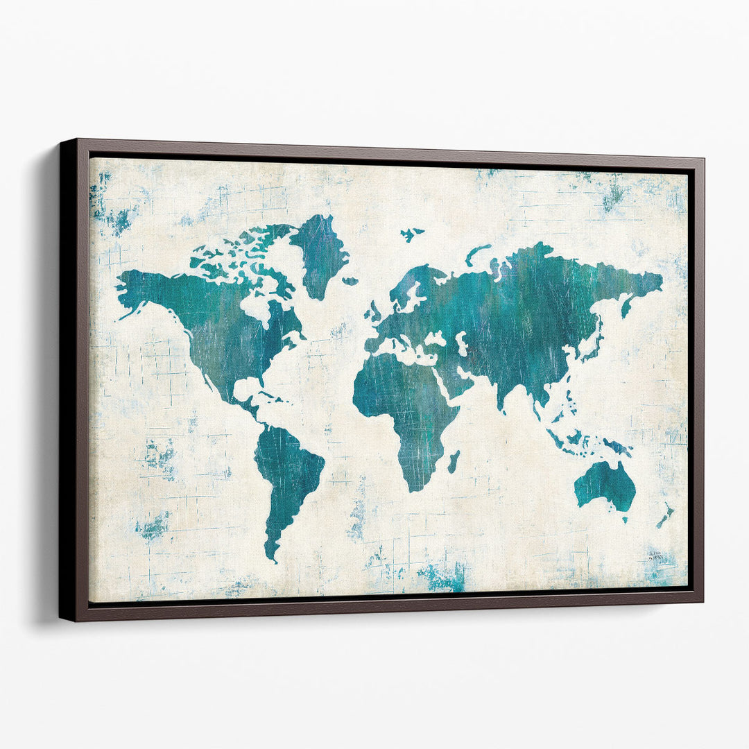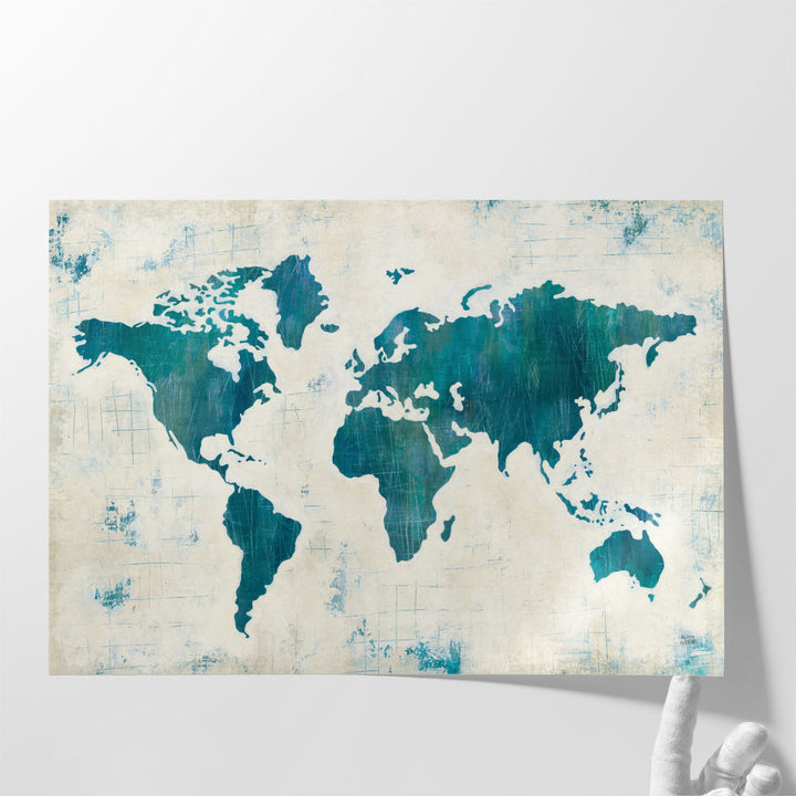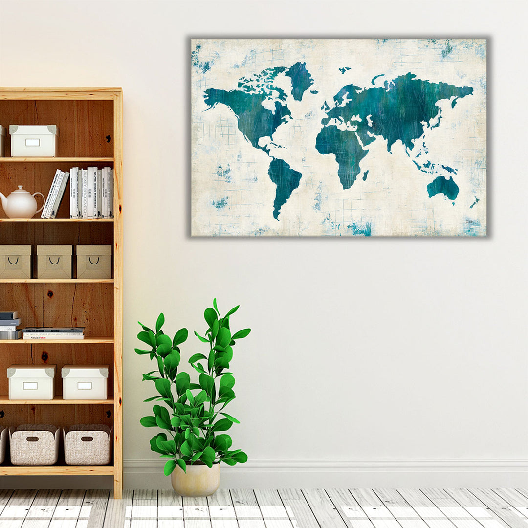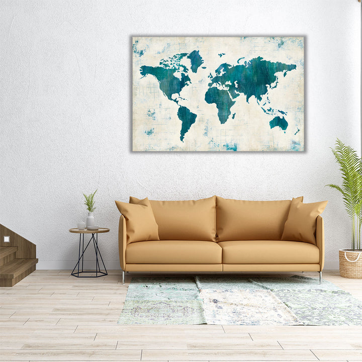 A stunning world map showcasing blue and neutral tones, perfect for adding a touch of elegance to any space.