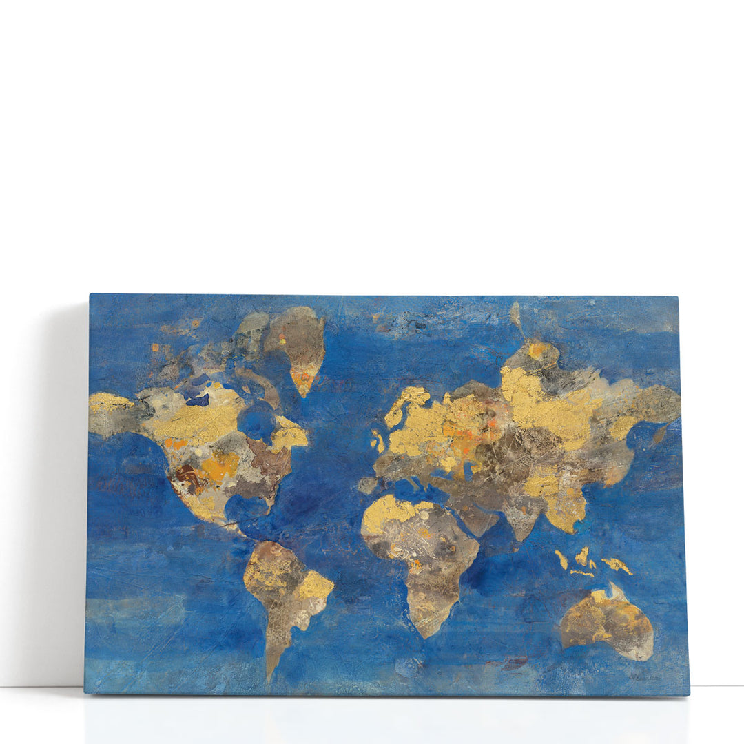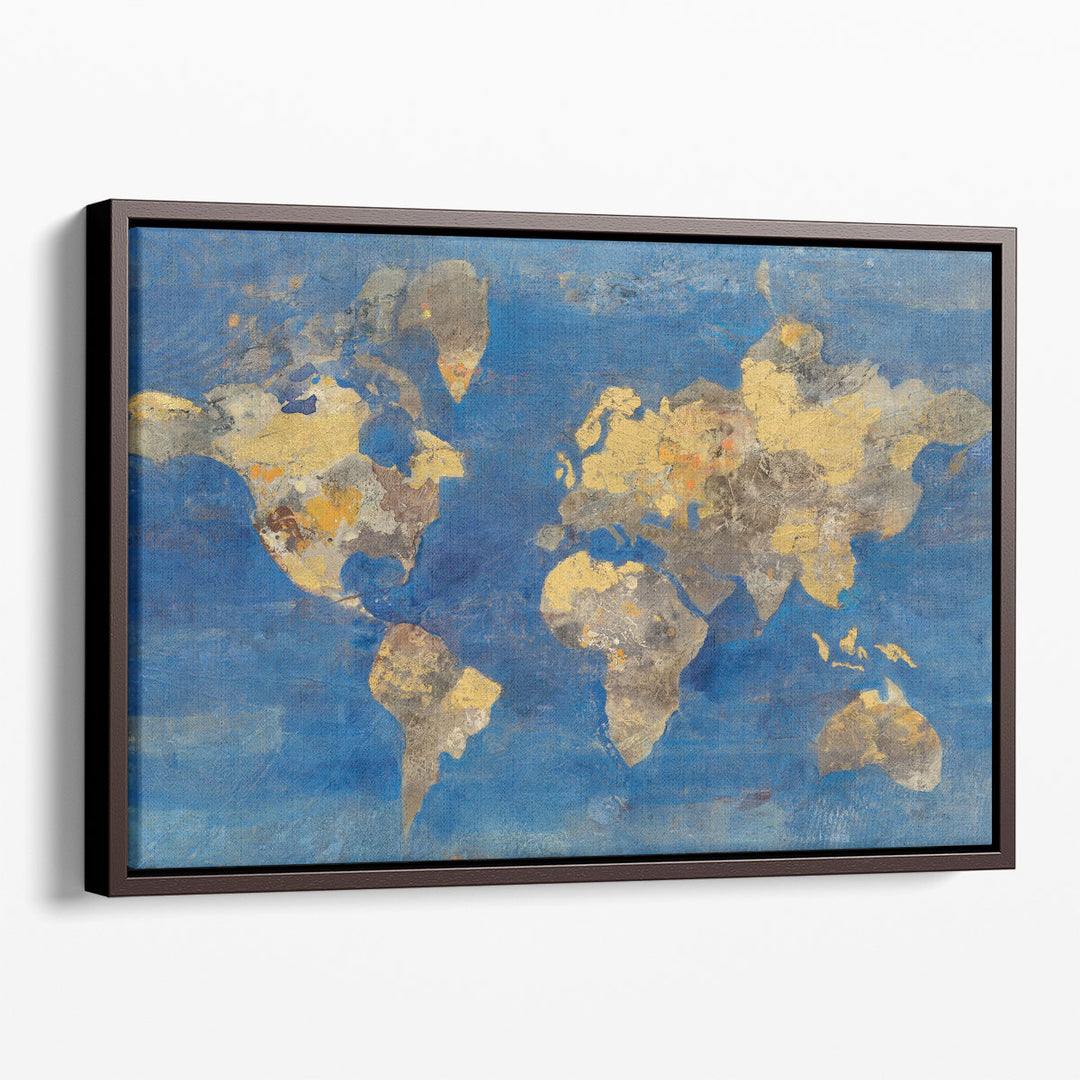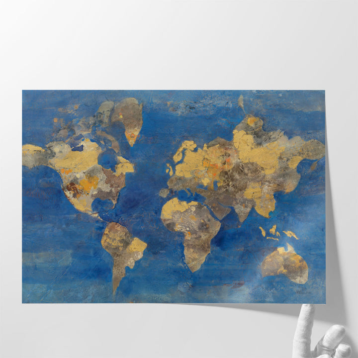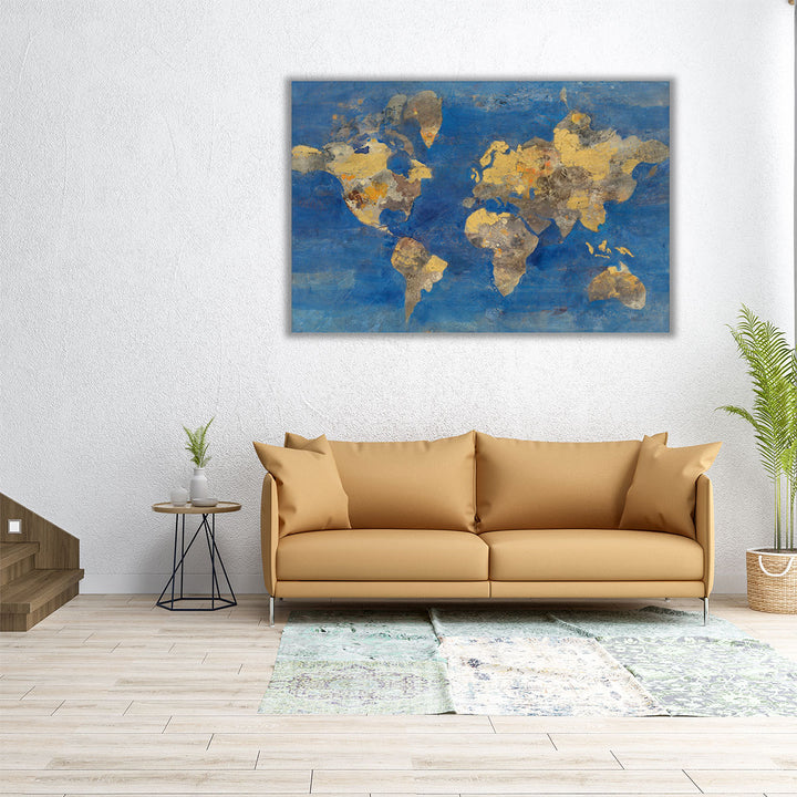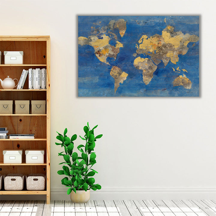 This stunning piece features a yellow world map set against a vibrant blue background, adding a touch of elegance to any room.